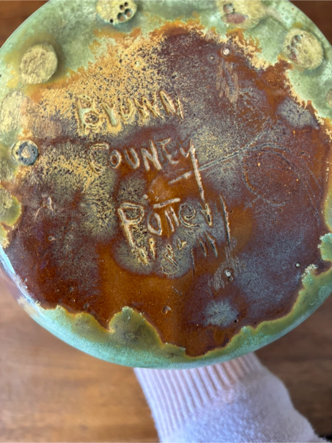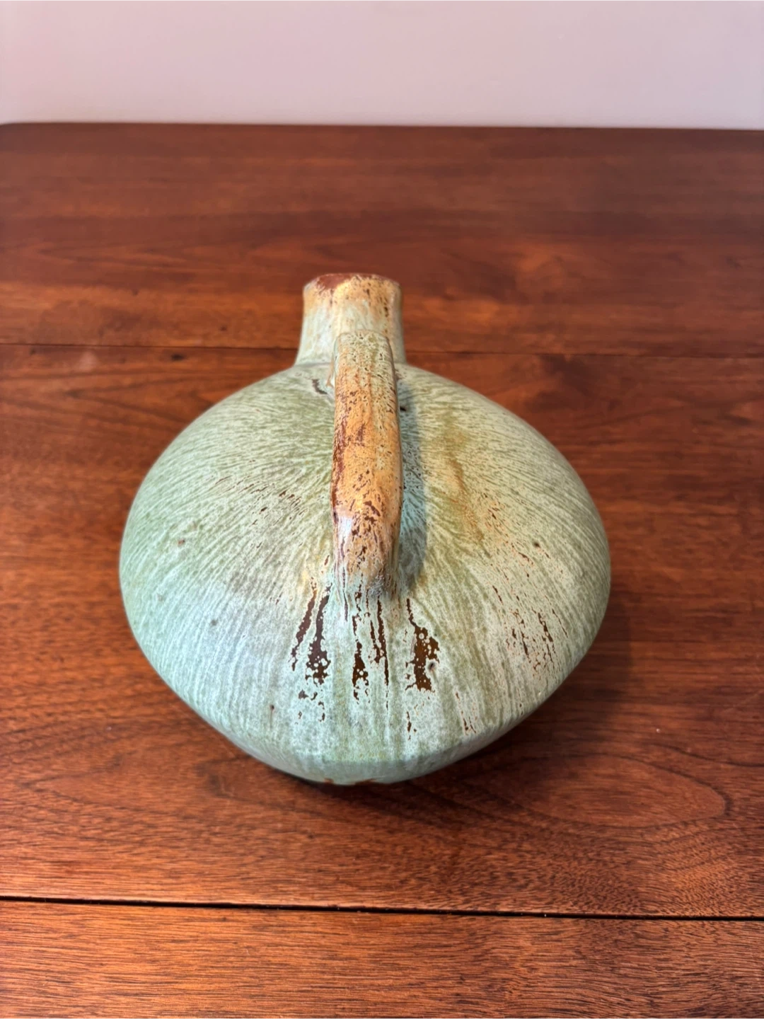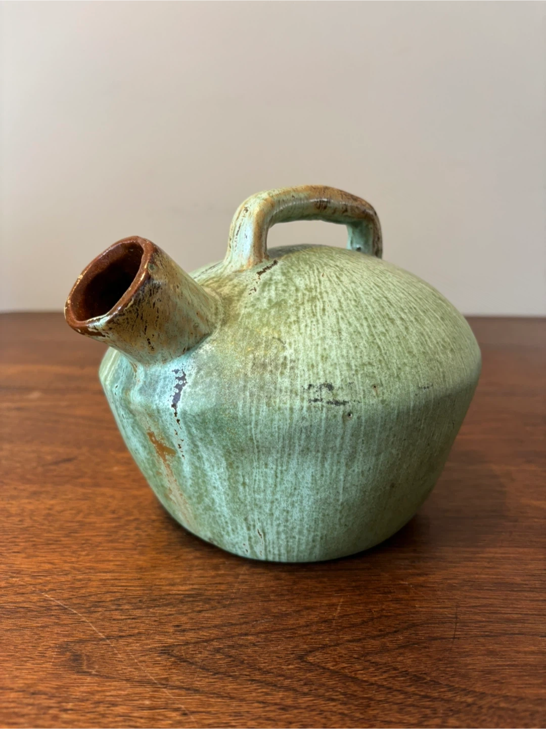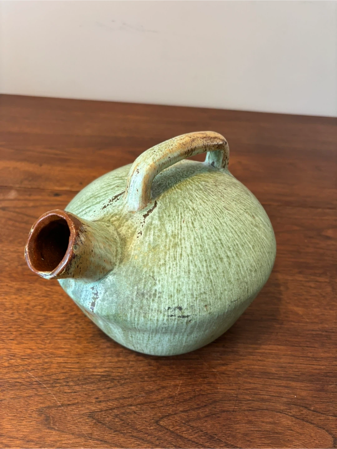 Selling a charming pottery pitcher! It's a lovely light green colour with a rustic handle. Perfect for adding a touch of character to your home
