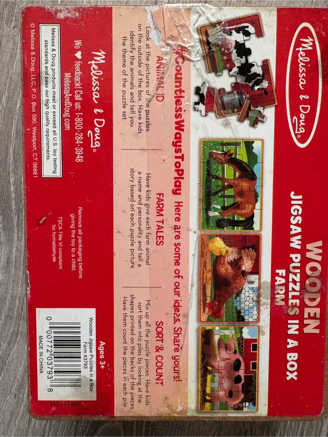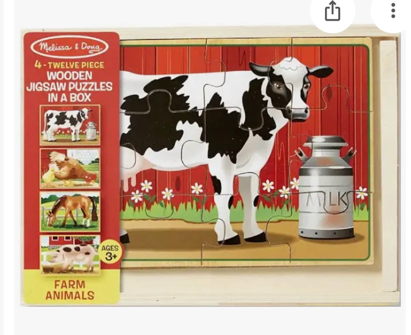 This is a Melissa & Doug wooden jigsaw puzzle in a box. It features 4 farm animals and is suitable for ages 3+