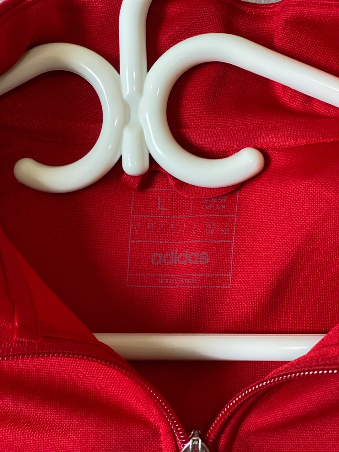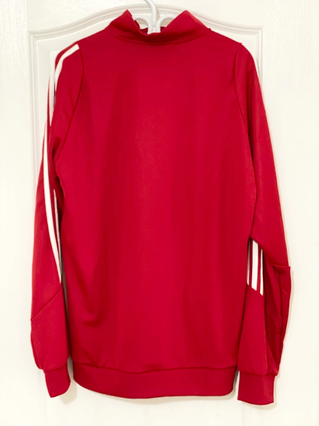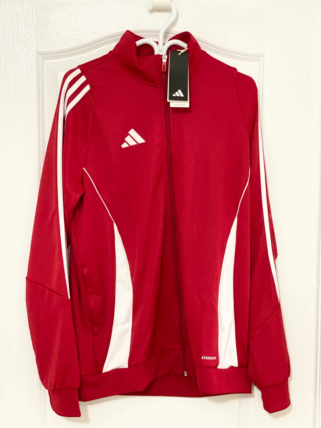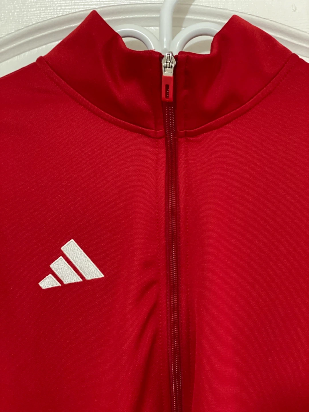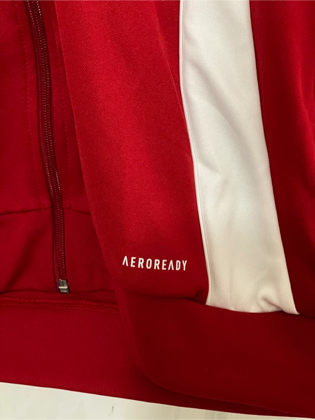 Selling a red Adidas AEROREADY track jacket in size large! It's in great condition and perfect for workouts or casual wear. The jacket features the classic Adidas three-stripe design and AEROREADY technology to keep you dry and comfortable.