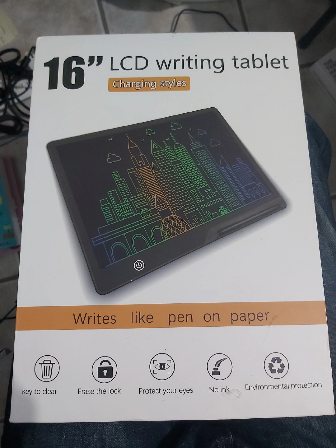 Selling a brand new 16" LCD writing tablet! It's still in its original box. Writes like pen on paper, features include a key to clear, erase the lock, protect your eyes, no ink, and environmental protection. Enjoyable in larger sizes!
