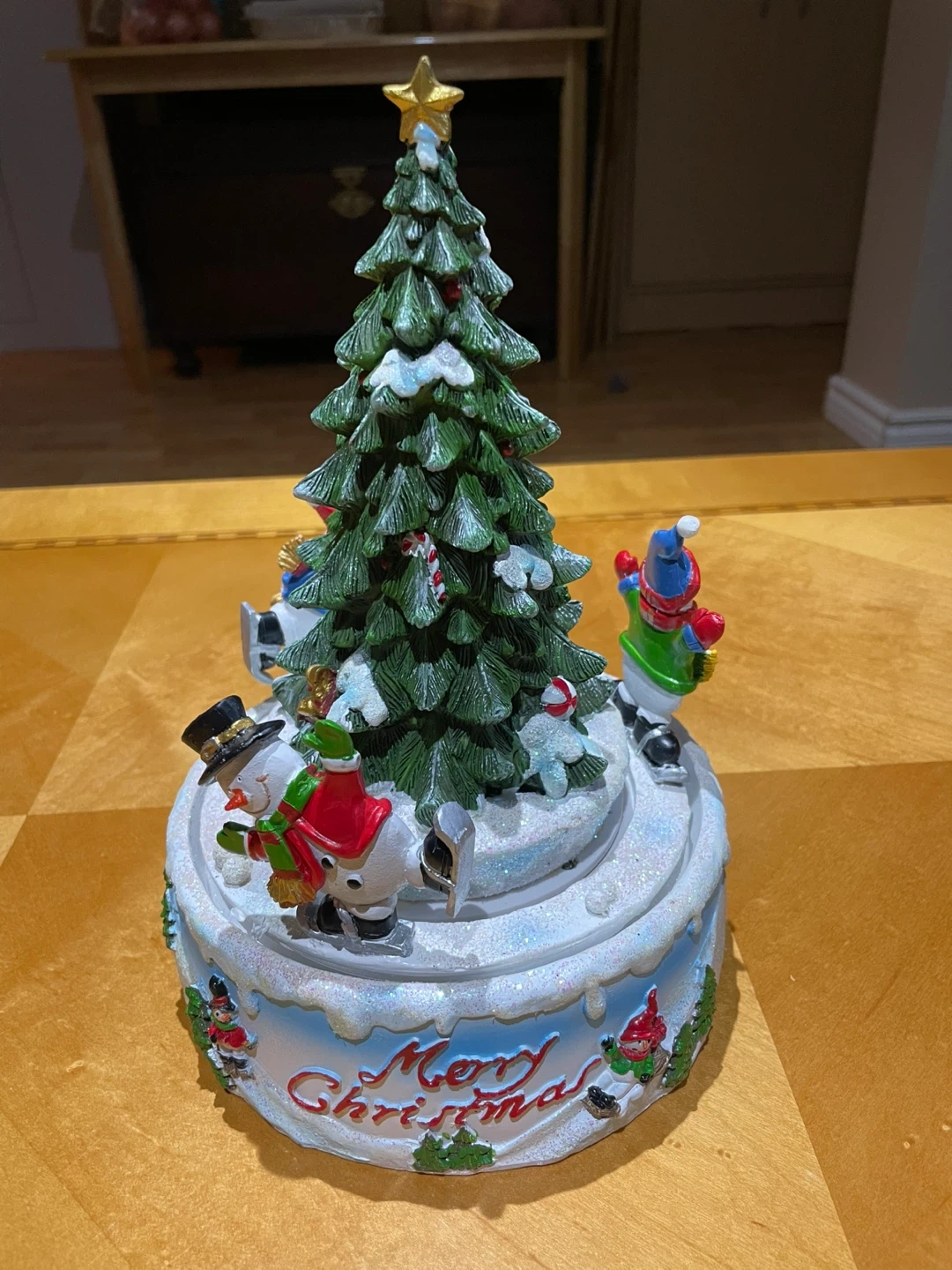 A charming Christmas tree musical decoration! It features three figure skaters around the tree and plays Christmas music. The base has 'Merry Christmas' written on it, making it a festive addition to your holiday decor