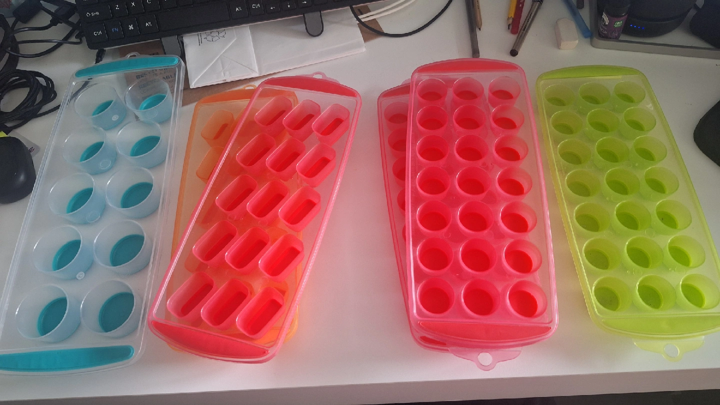 Selling a set of ice cube trays in various colours: blue, orange, red, and green. They're perfect for making ice for your favourite drinks!