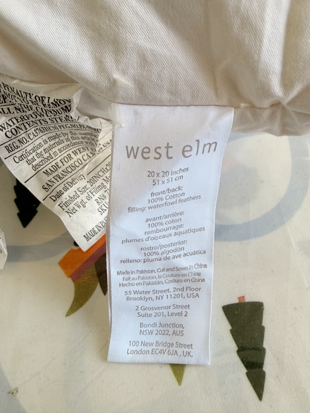 3pcs Like new West Elm decorative pillow insert with pillow casing and dohar , It's 20" x 20" and made with 100% cotton front and back, and filled with waterfowl feathers. Perfect for adding a cozy touch to your living space