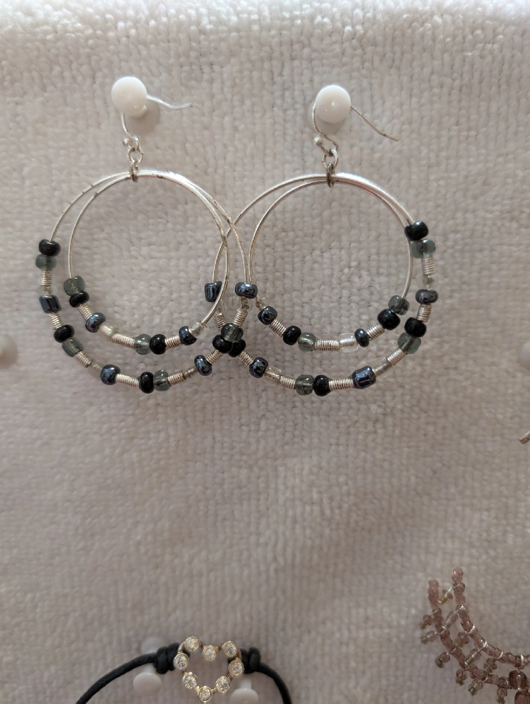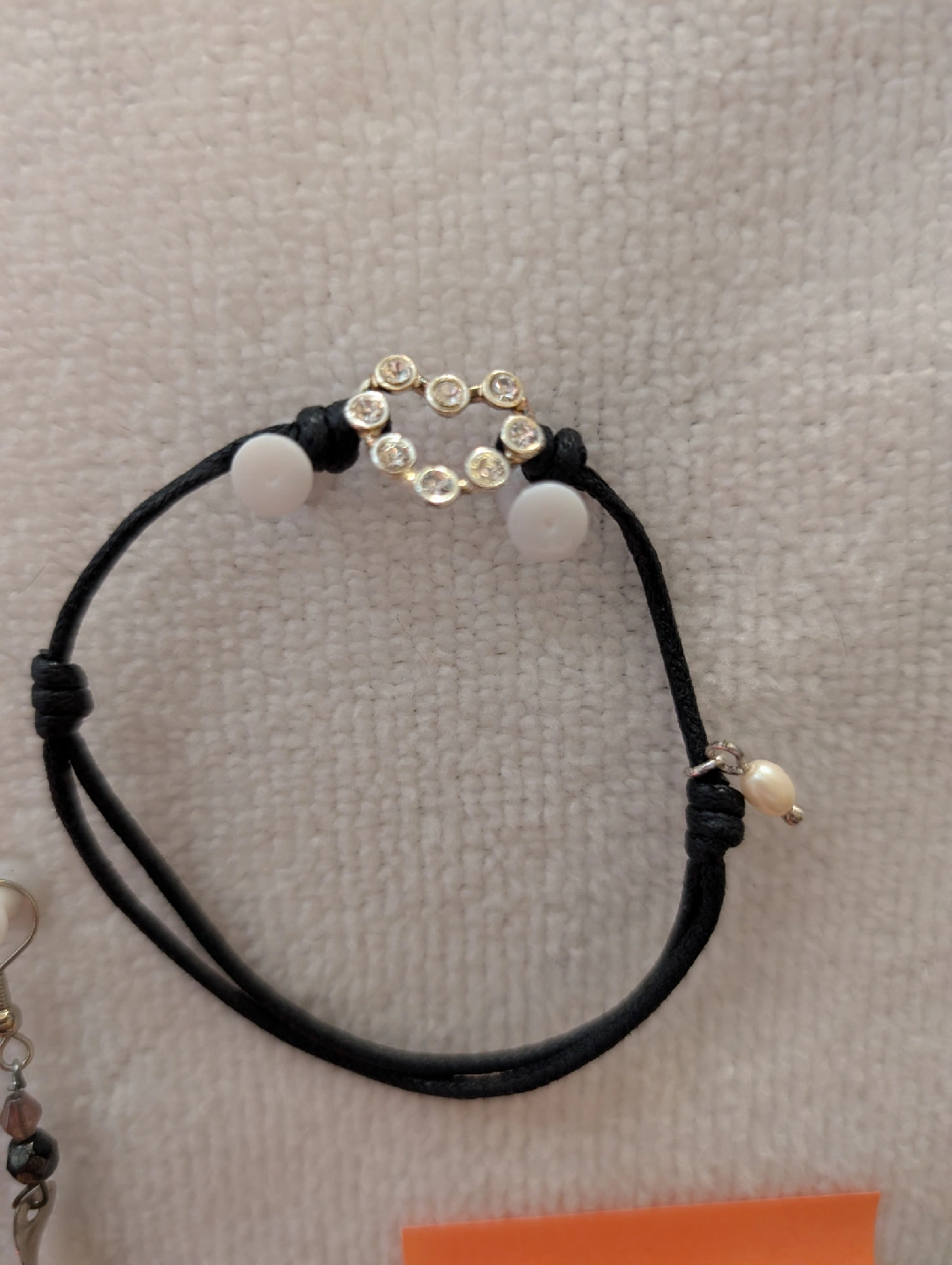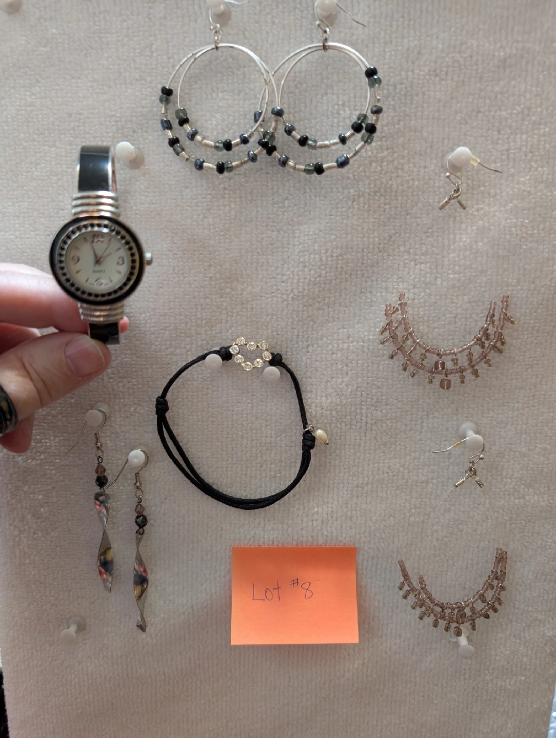 Selling a collection of earrings (3 pairs), a bracelet and a watch. There are a few different styles of earrings, including hoop earrings with beads and dangling earrings. The pale mauve bead earrings are threaded on clear line. The bracelet is black string with a heart-shaped design. The watch is also black and a bracelet style. I'm not sure if it's ever been worn but will need a new battery. All in great used condition. Lot #8