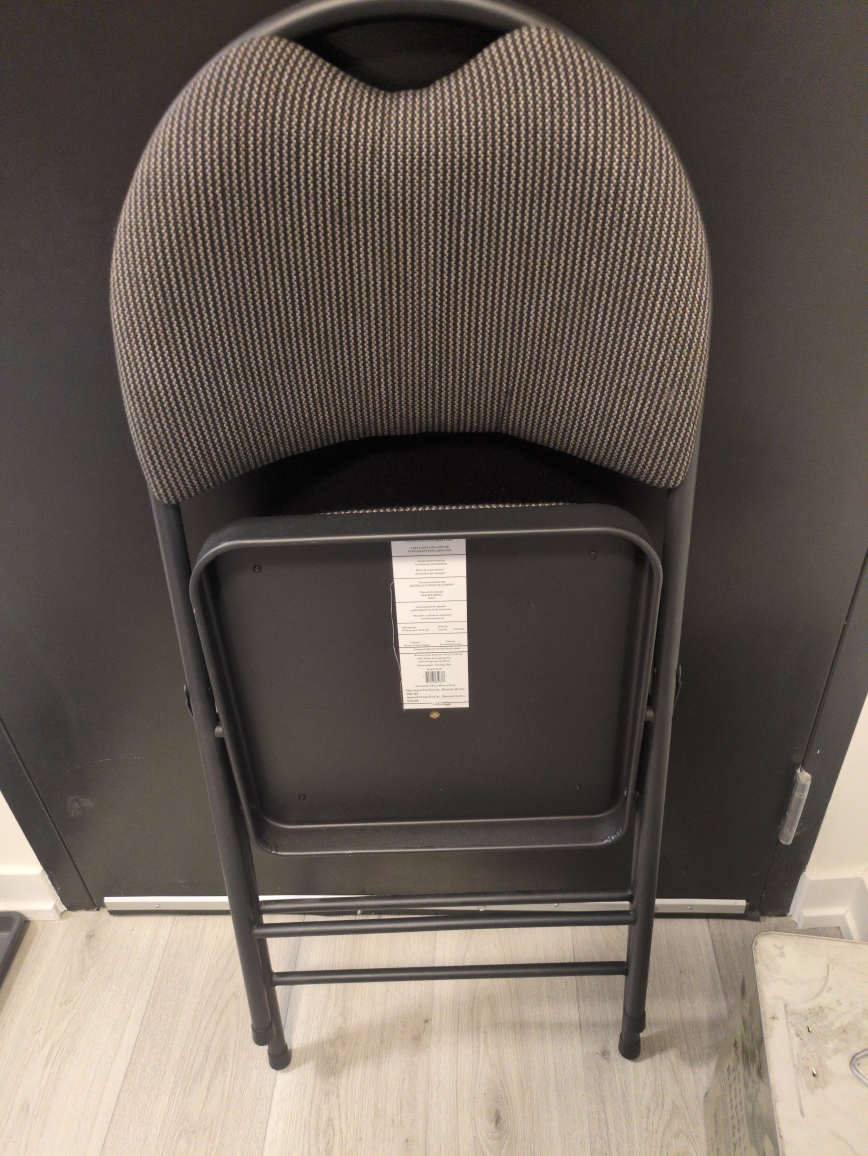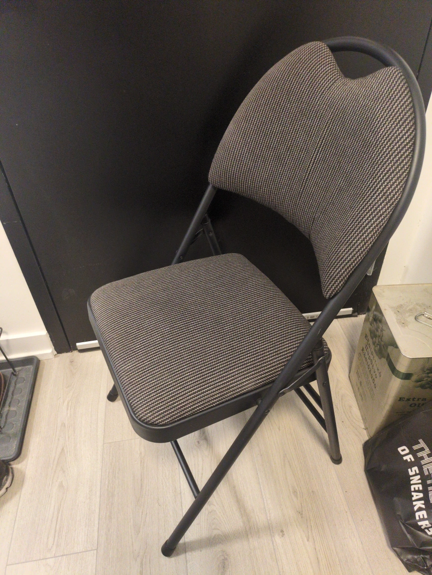 Here's a handy folding chair in a neutral grey and black colour scheme. It's lightweight and easy to store when not in use. Perfect for extra seating when you have guests over!