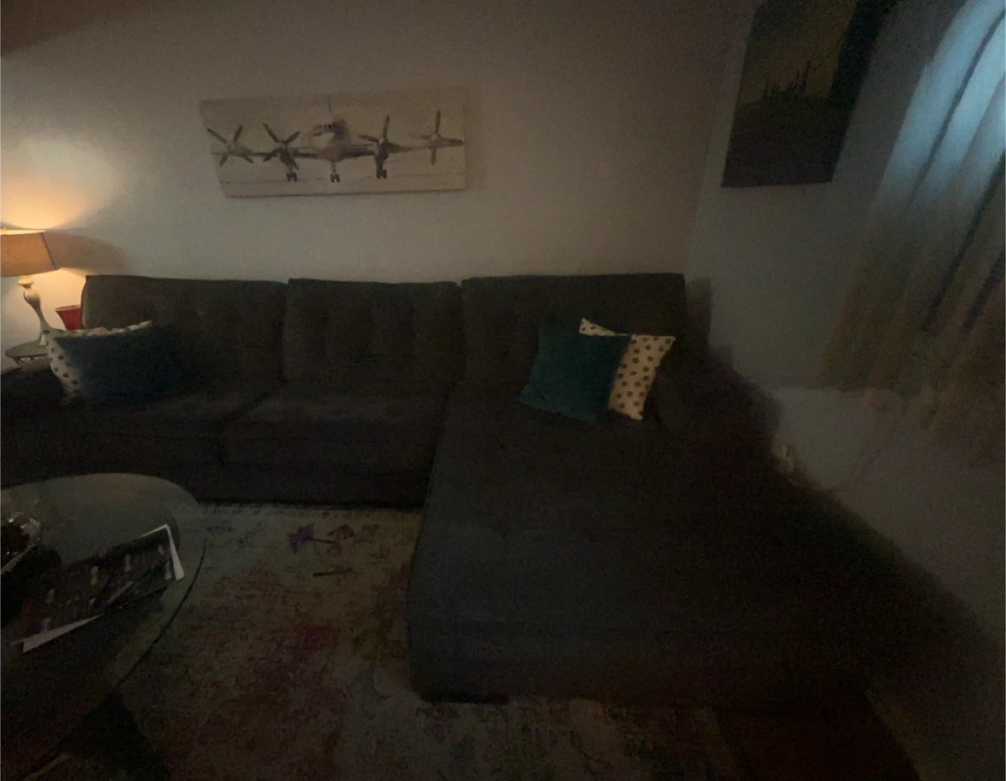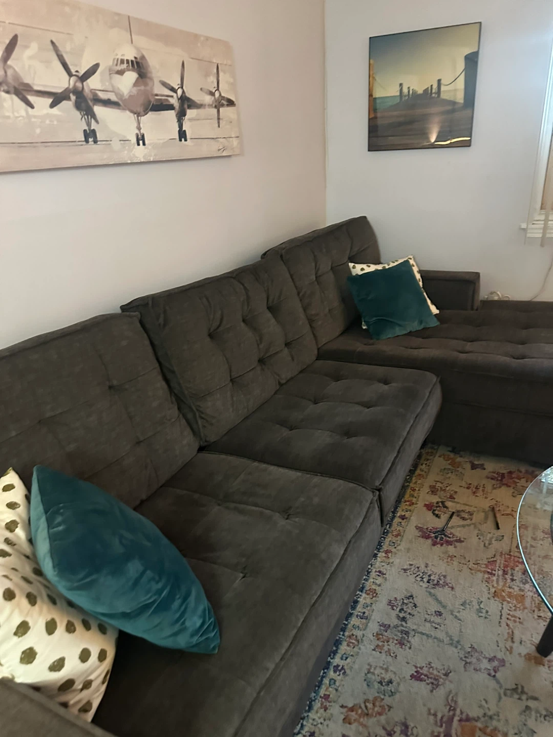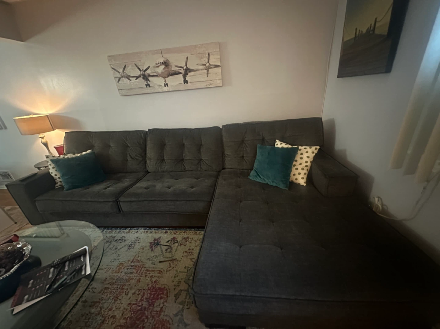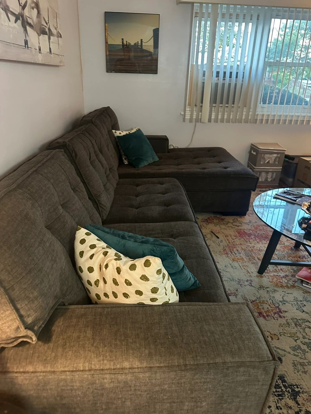 Selling a comfortable gray sectional sofa. It's in good condition and ready for a new home. Perfect for a living room or entertainment area