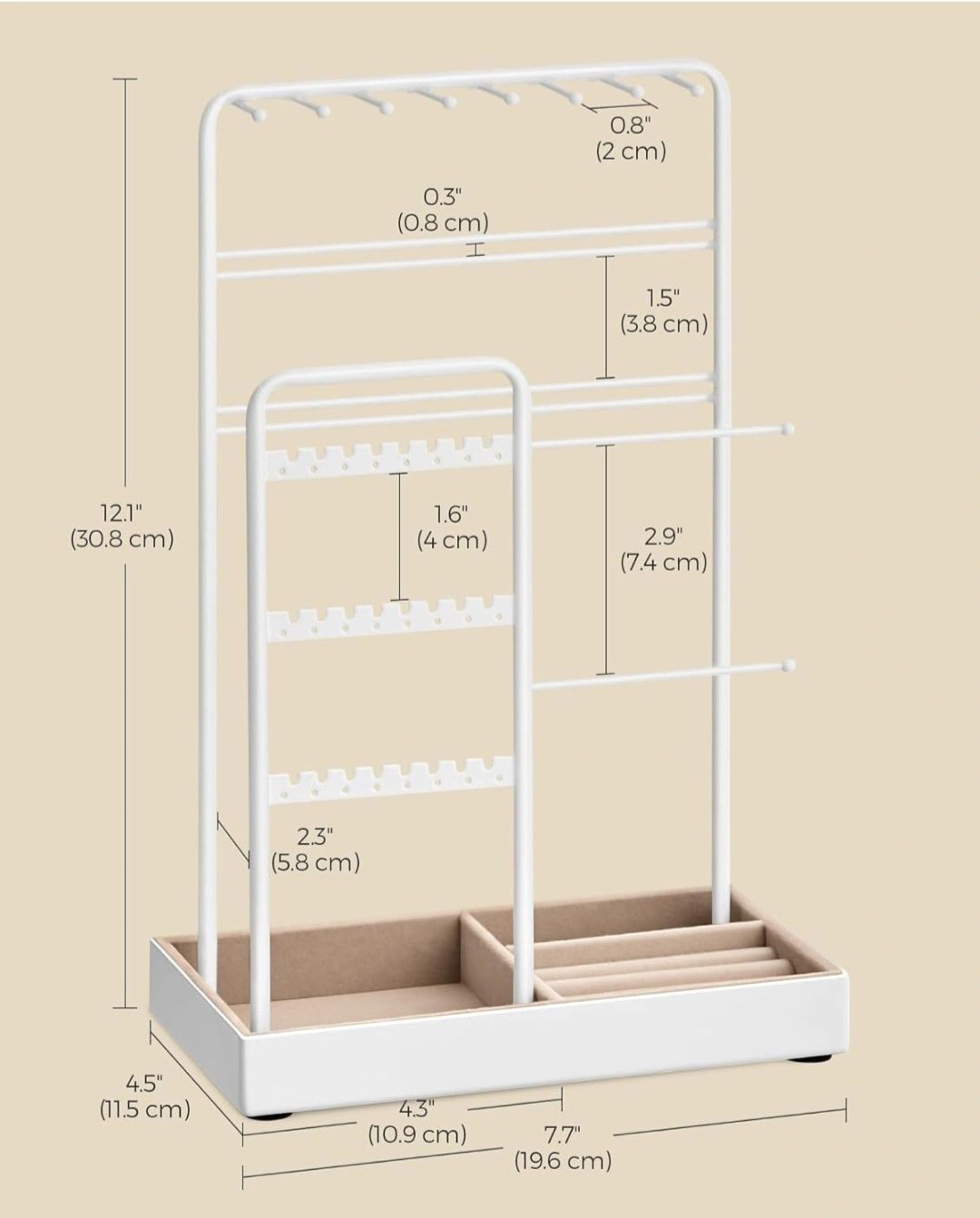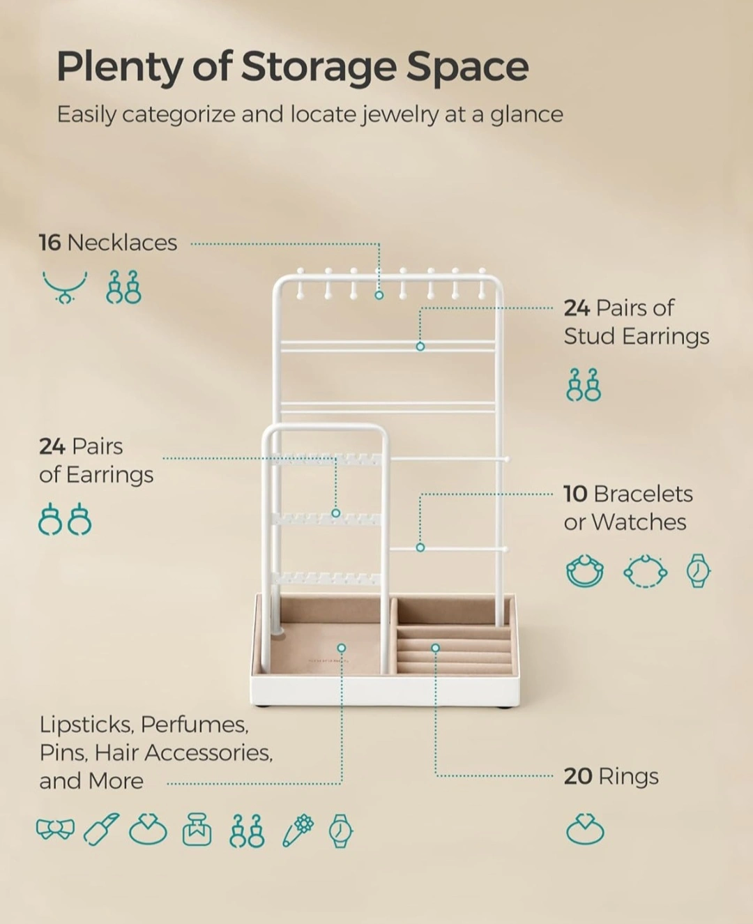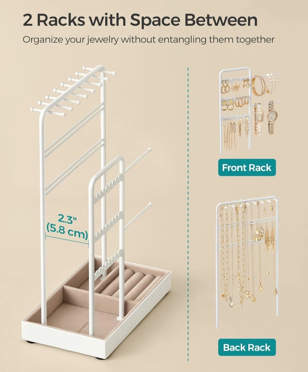 SONGMICS Jewelry Holder, Jewelry Organizer, Jewelry Display Stand with Metal Frame, Velvet Tray, Necklace Earring Bracelet Holder, for Studs, Rings, Gift Idea, Matte White UJJS021W01. 772