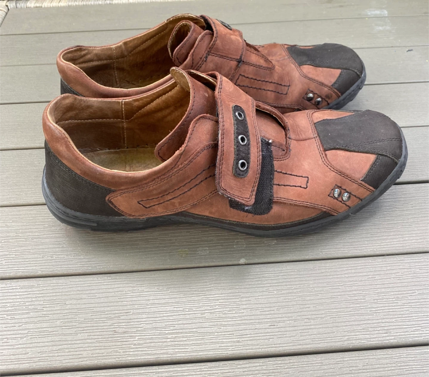 Selling a pair of brown leather shoes. They have a Velcro strap closure