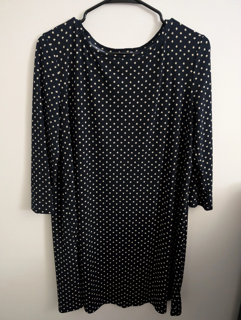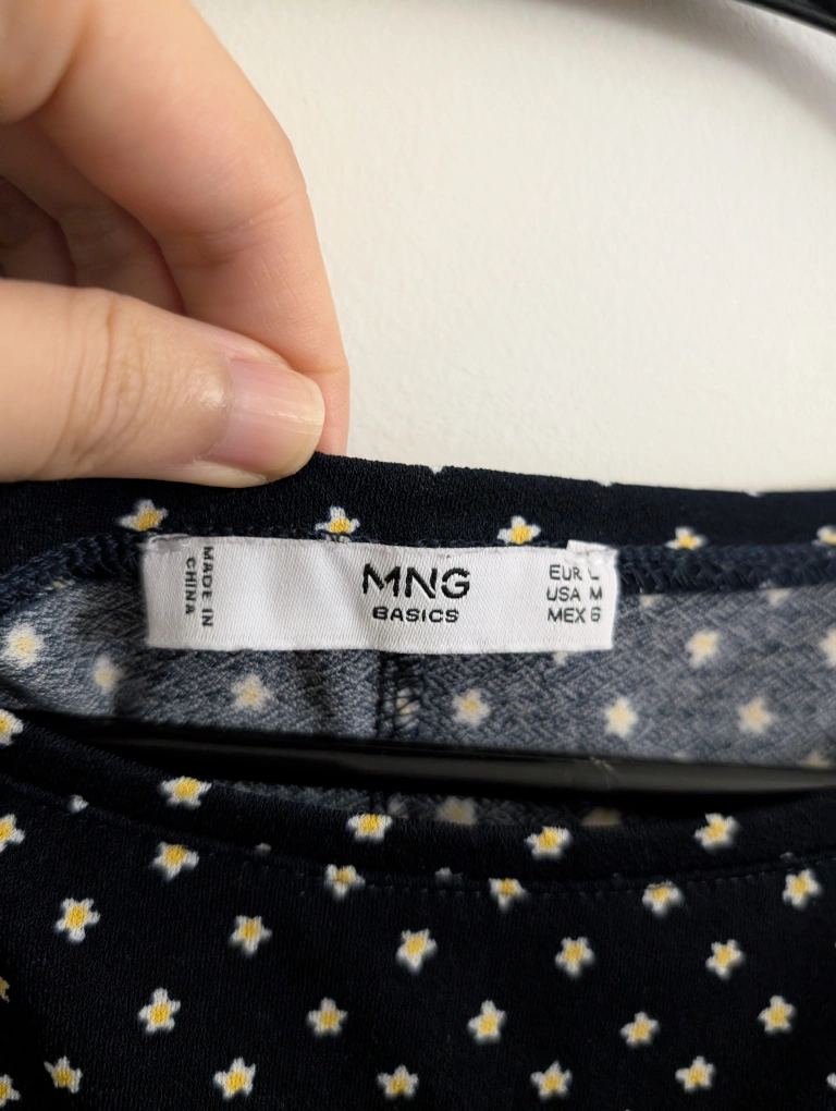 Selling a cute MNG Basics dress! It's a black dress with a small floral pattern. The size is L, and it's in great condition