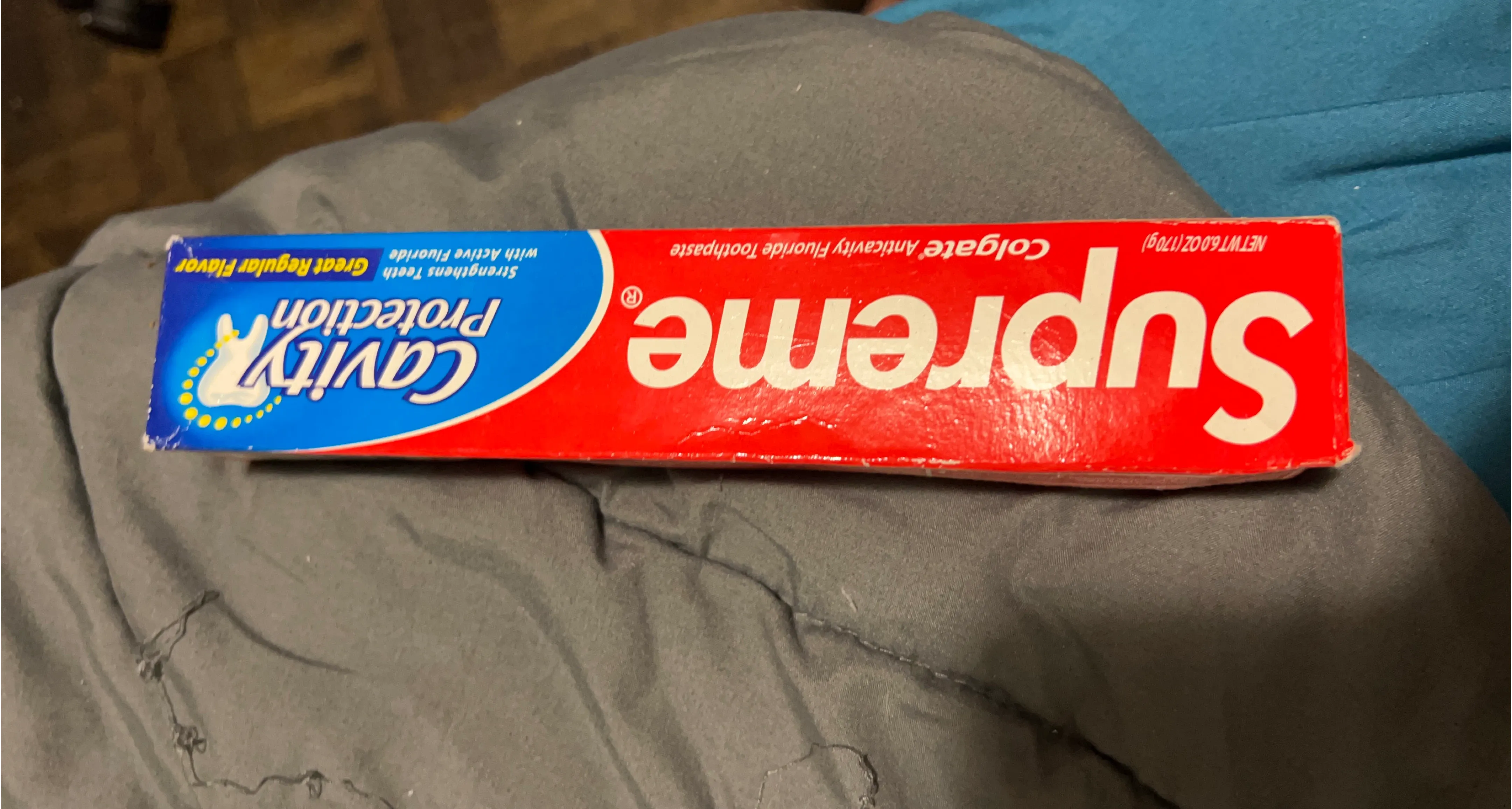 Selling a tube of Supreme x Colgate Anticavity Fluoride Toothpaste. Strengthens teeth with active fluoride and offers cavity protection with a great regular flavour. Net weight 6.0 OZ (170g)