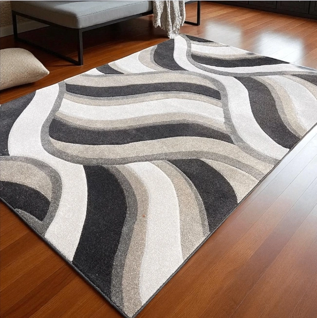 Elevate your living space with this stylish and versatile modern abstract area rug. Featuring a captivating wavy design in a sophisticated palette of grey, black, and white/ivory, this rug effortlessly complements a variety of decor styles, from contemporary to minimalist. The generous size of 79" x 113" makes it perfect for anchoring a living room, defining a dining area, or adding warmth and texture to a spacious bedroom.