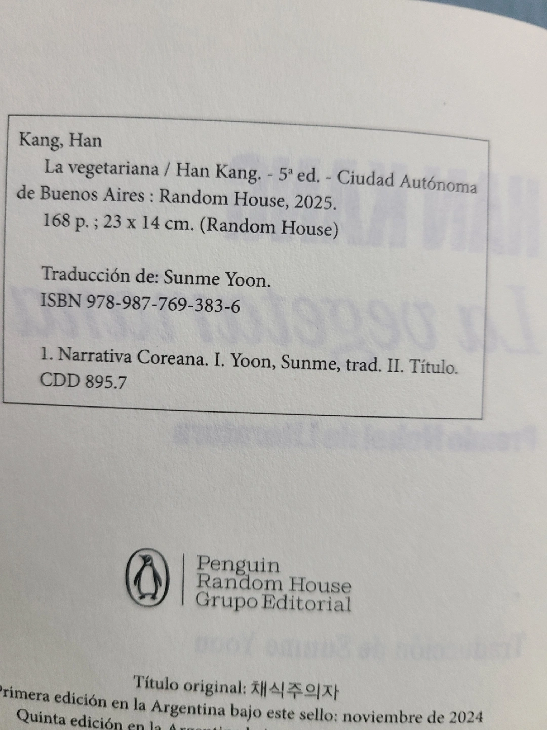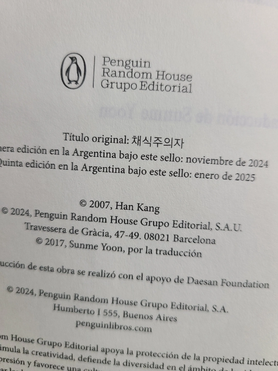 Selling a copy of "La vegetariana" by Han Kang, winner of the Nobel Prize in Literature. The book is published by Random House. It is 23 x 14 cm