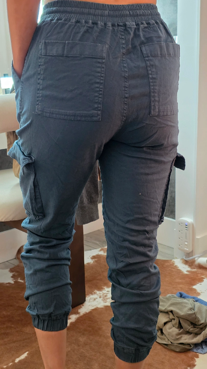 Selling a pair of blue cargo joggers. They have an elastic waistband and drawstring. The size is unknown, but they fit like a small or medium. Great for casual wear!