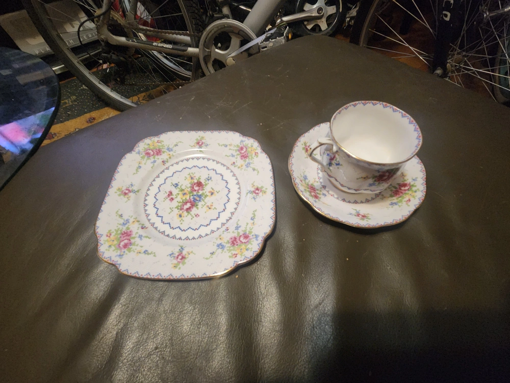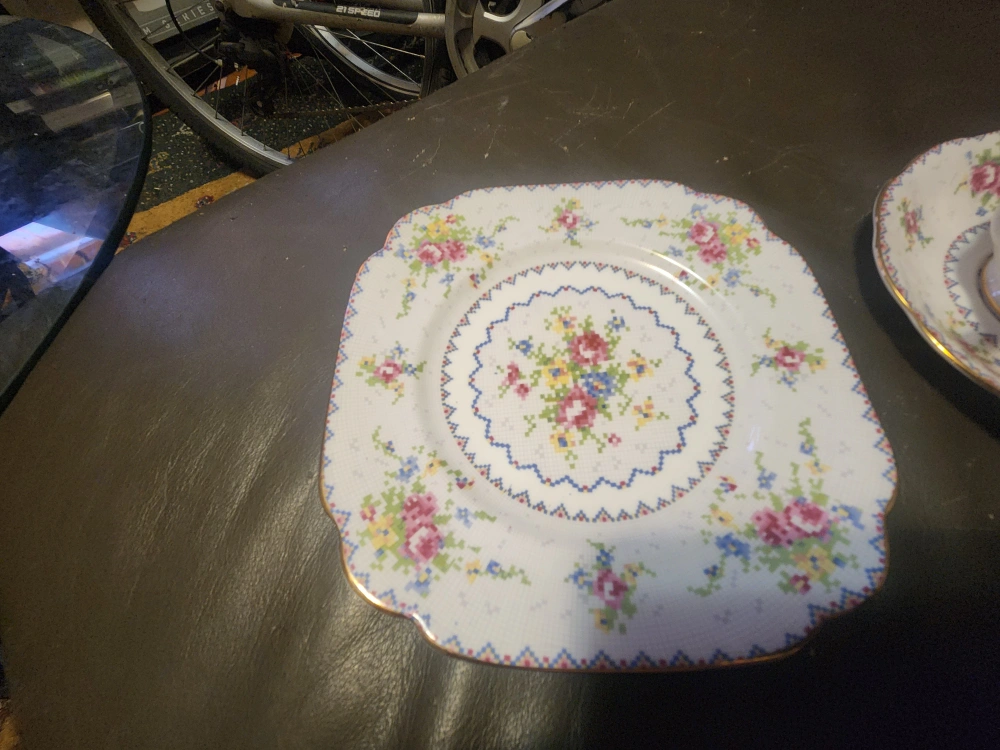 Here's a lovely Royal Albert Petit Point Bone China tea set! It includes a teacup, saucer, and square plate. Perfect for adding a touch of elegance to your tea time