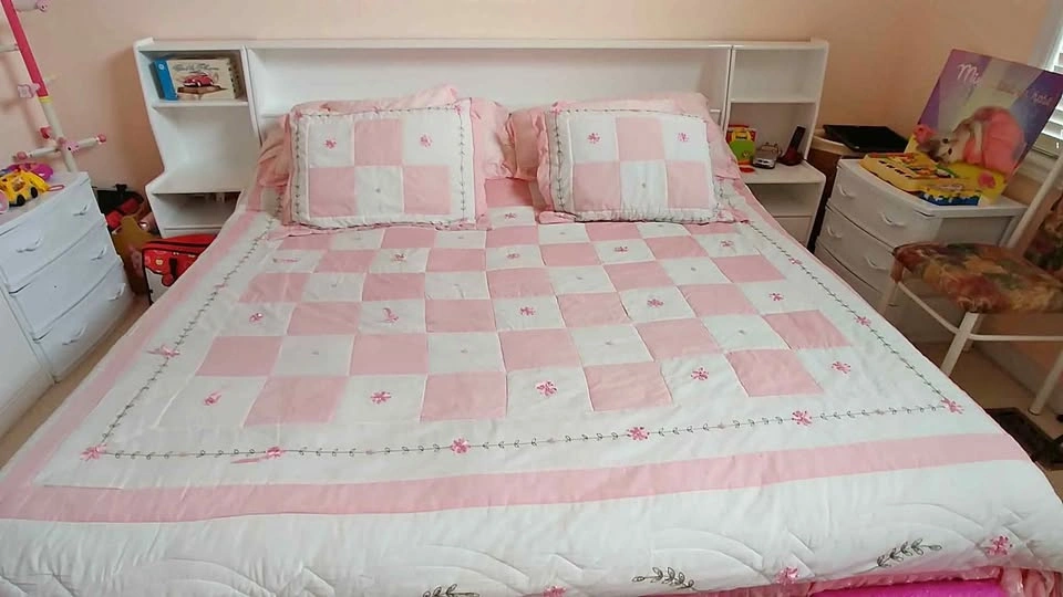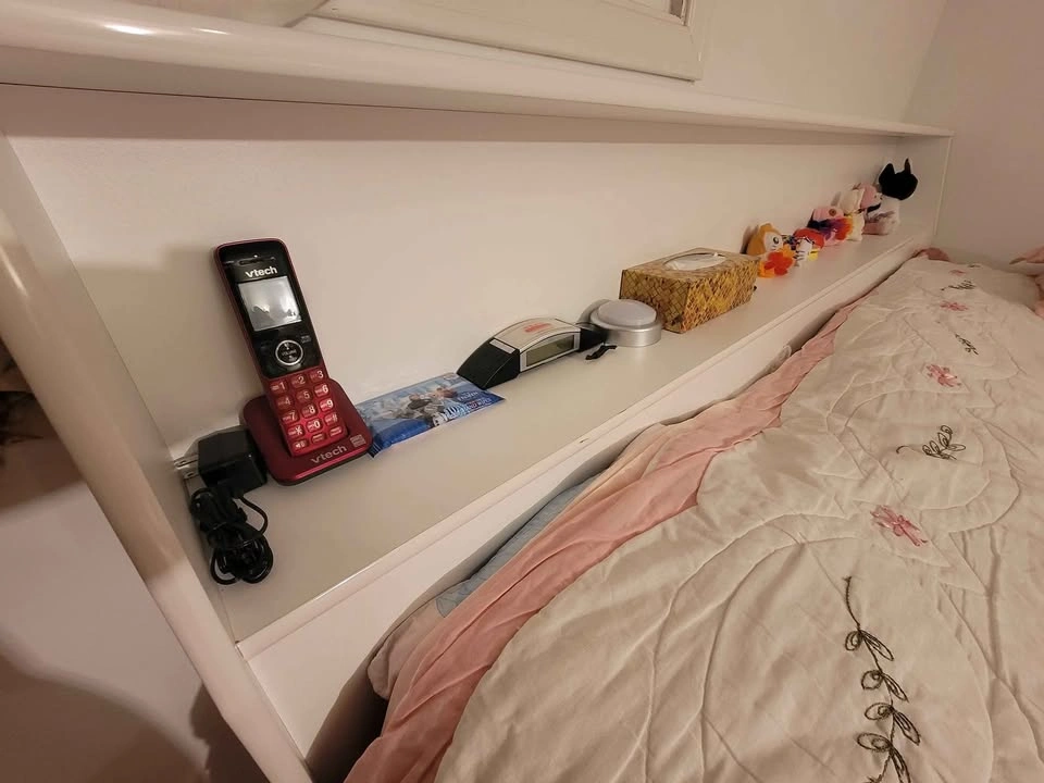 Heavy-duty, sturdy, and beautiful custom-built bed frame and headboard with a huge shelf. Excellent condition. Originally $1750 excluding tax (custom-built).