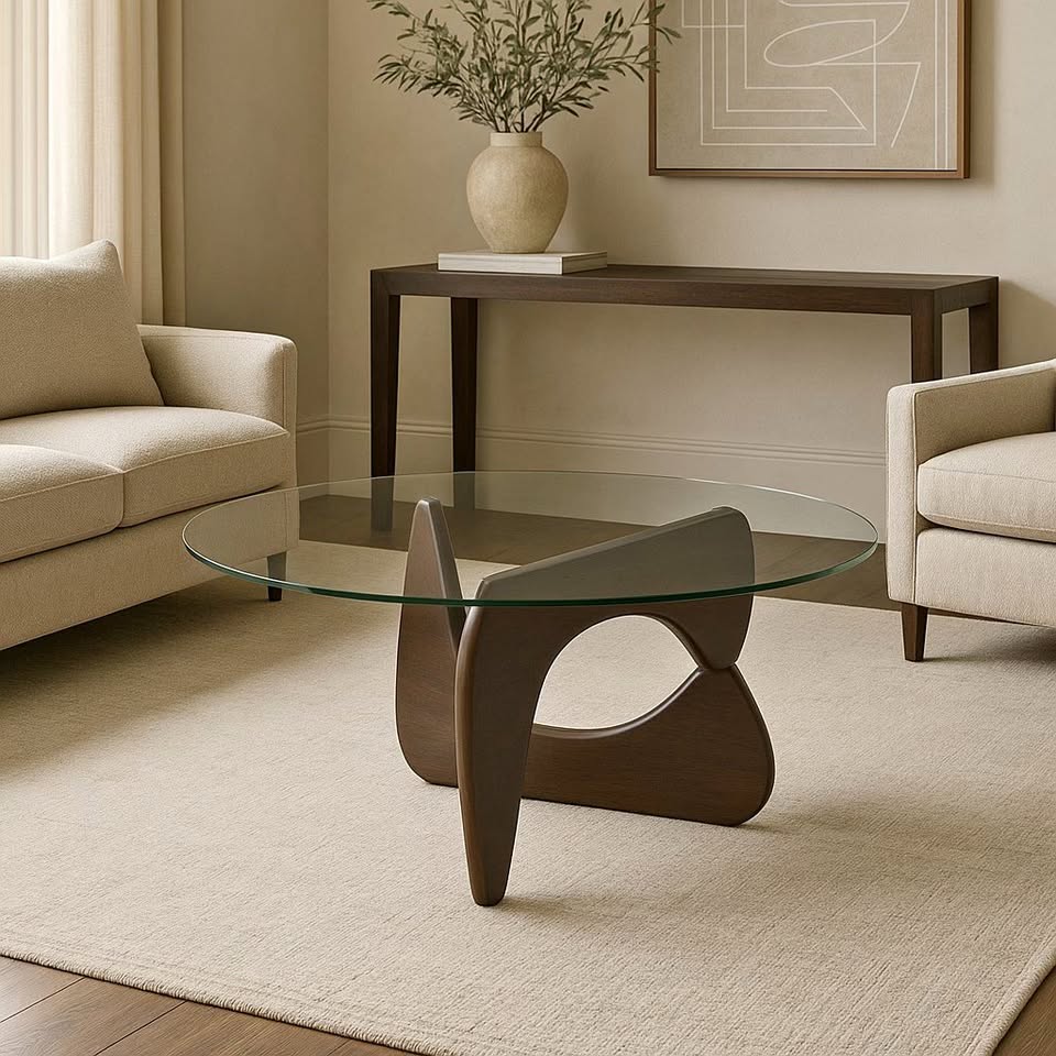 Elegant coffee table featuring a tempered glass top and solid rubber wood base in a natural walnut finish.