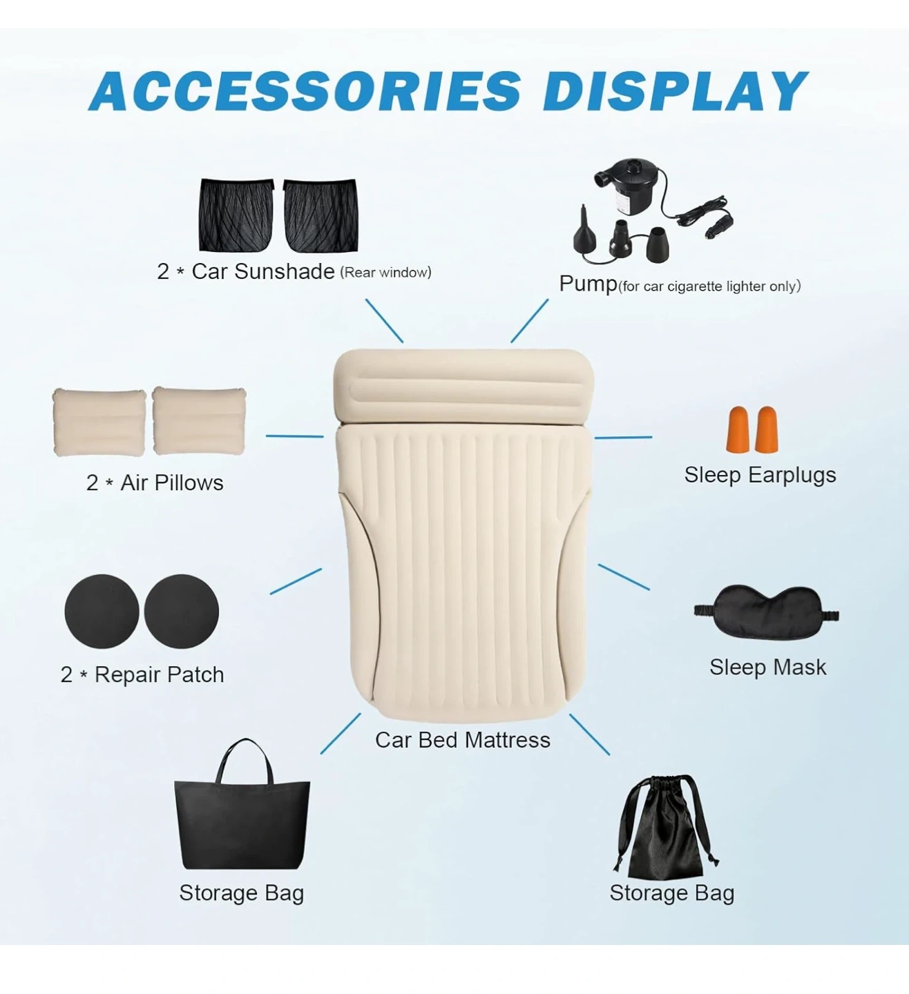 - Includes accessories like car sunshades, air pillows, a pump, sleep earplugs, a sleep mask, repair patches, and storage bags