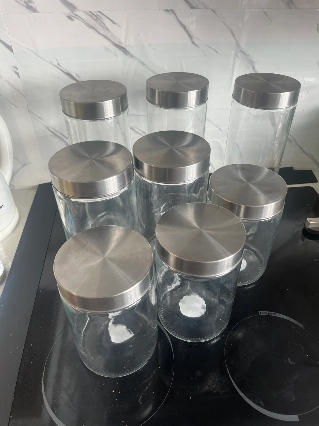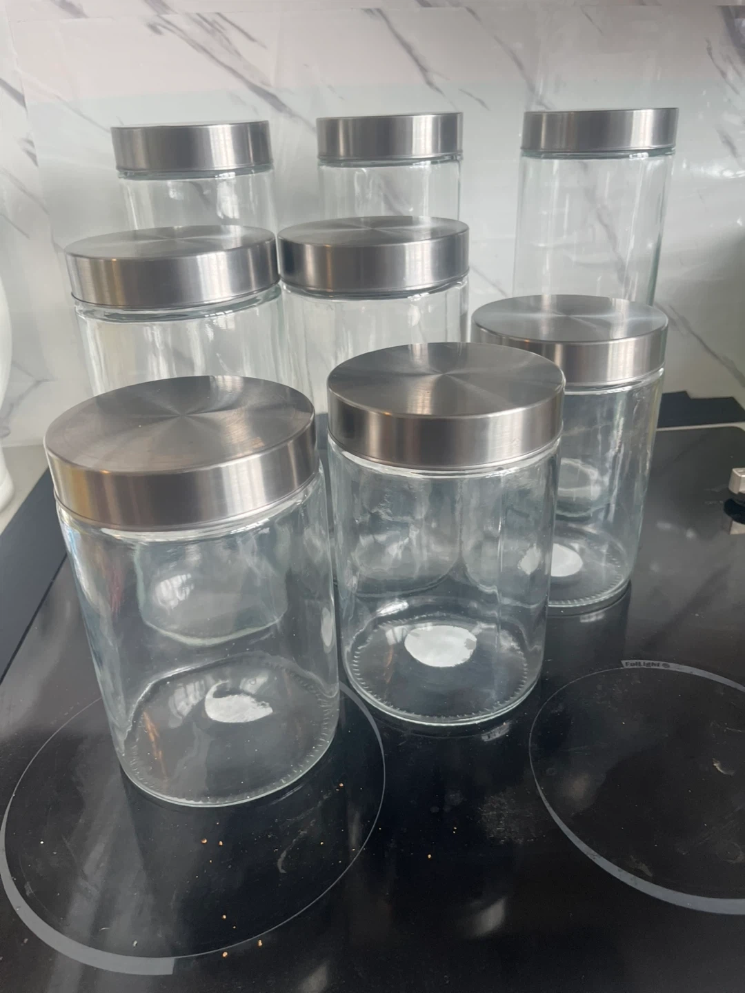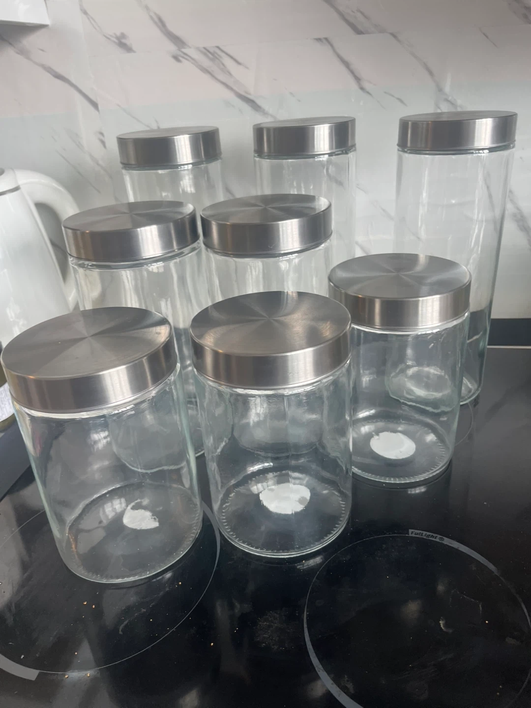 Selling a set of 8 glass kitchen canisters, each with a stainless steel lid. These are great for storing pantry staples and keeping your kitchen organized. They're in good condition and ready for a new home!