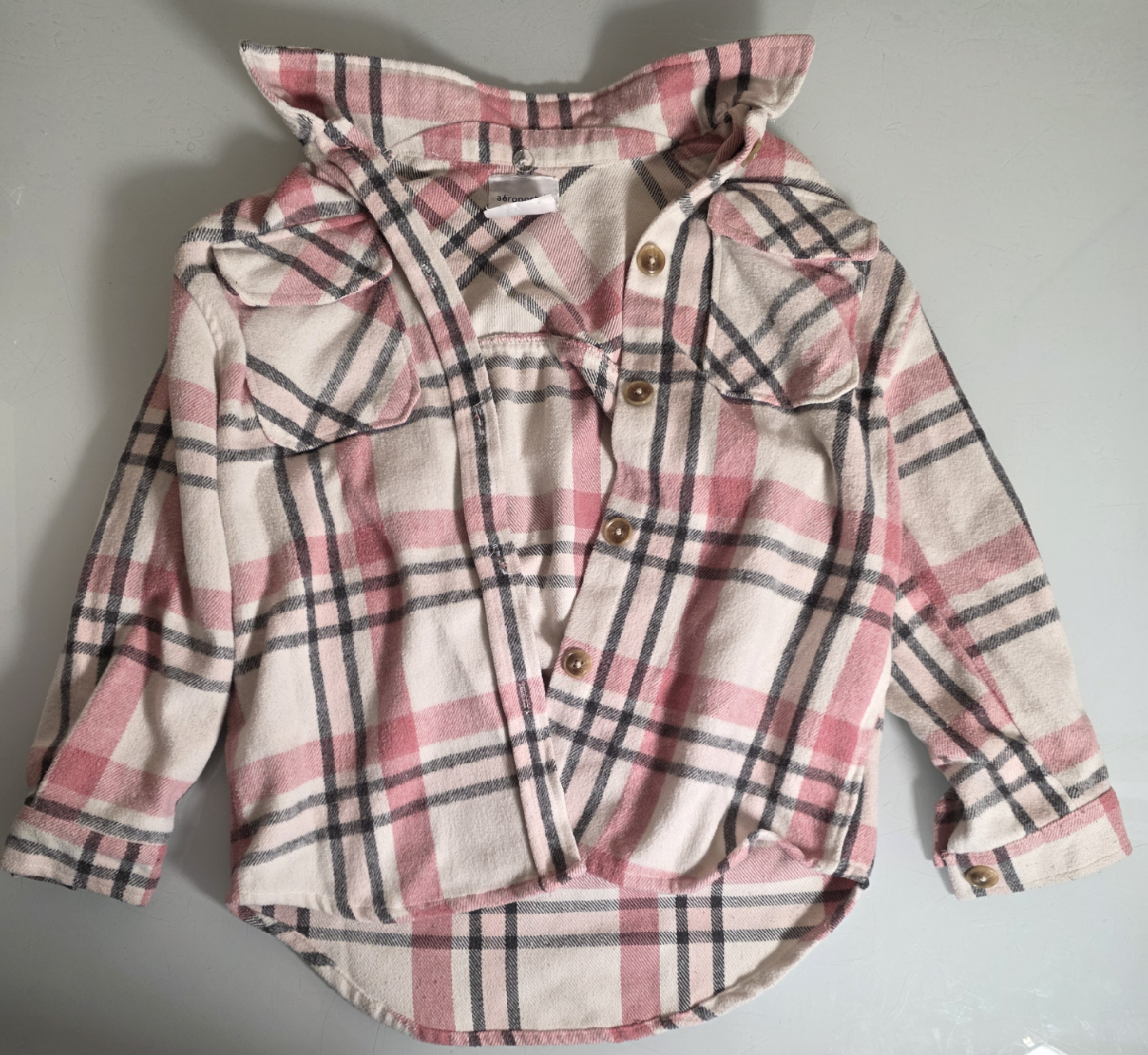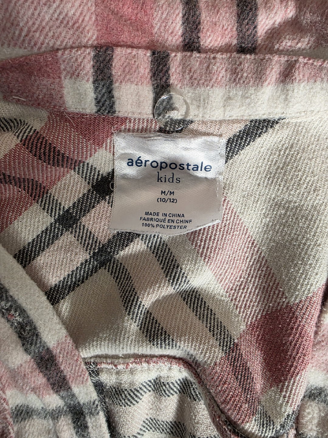 Cozy Aeropostale Kids flannel shirt in a stylish pink and black plaid pattern. It's a size M (10/12) and made from 100% polyester, making it both comfy and easy to care for. Perfect for layering or wearing on its own.