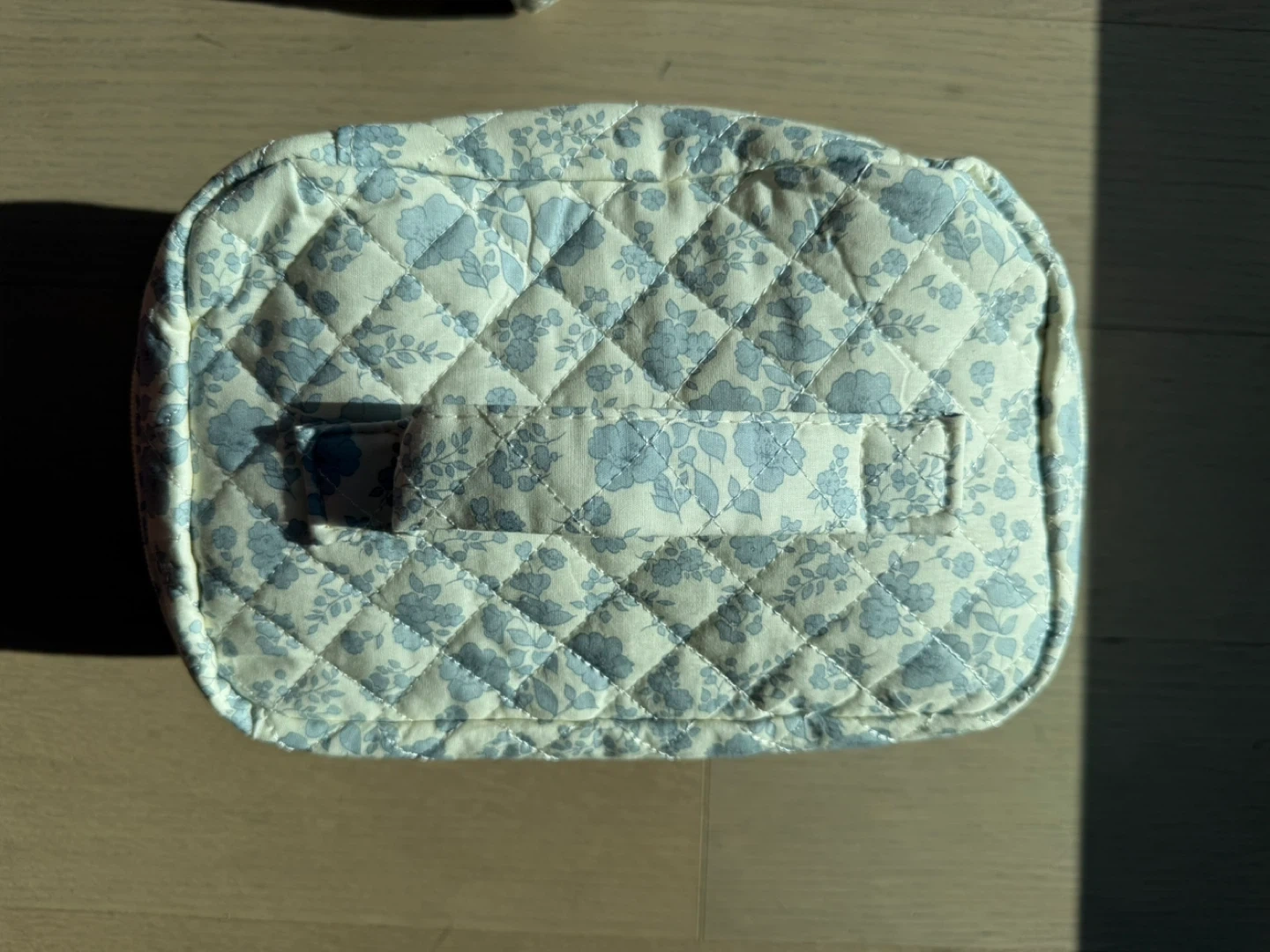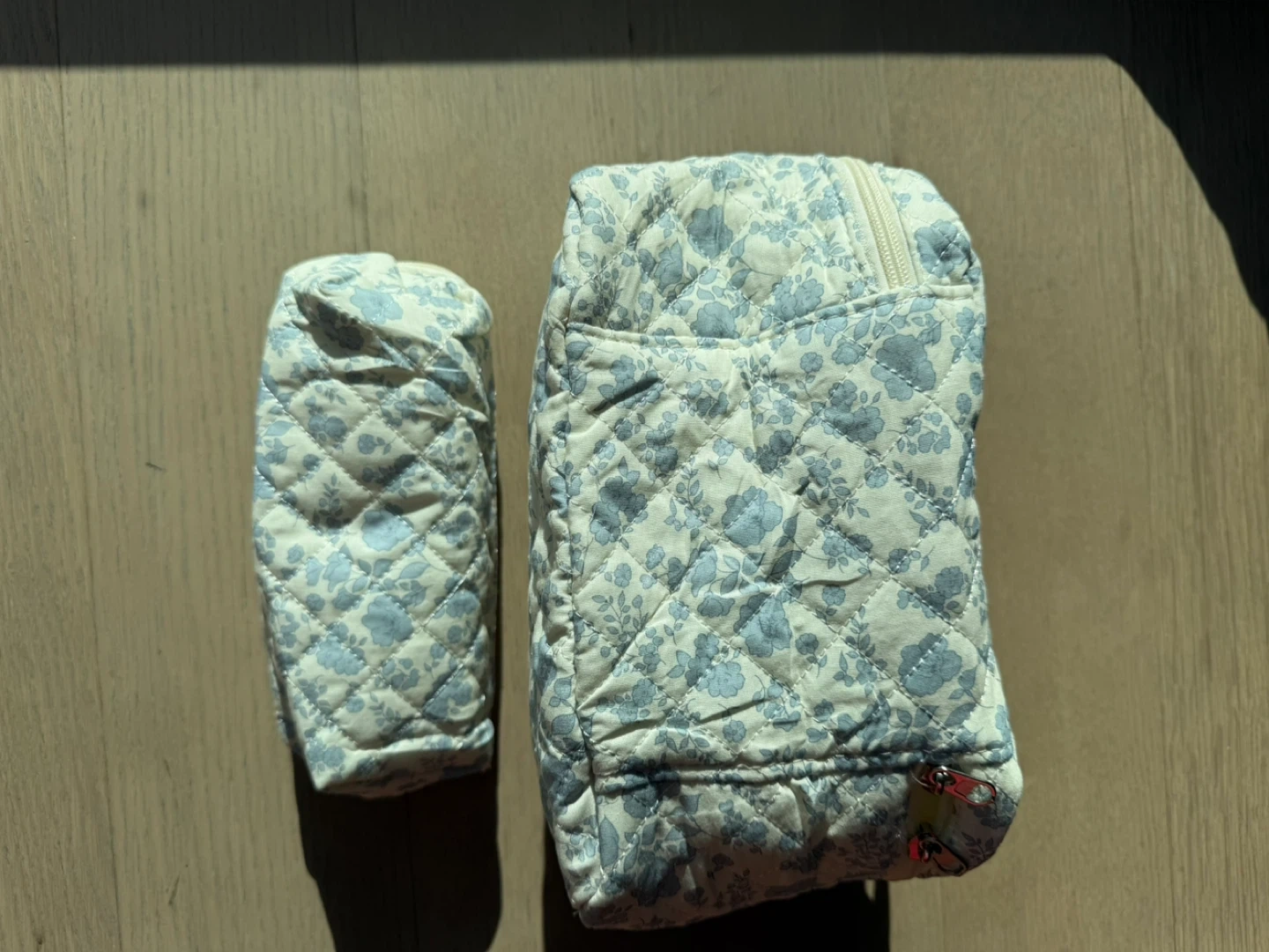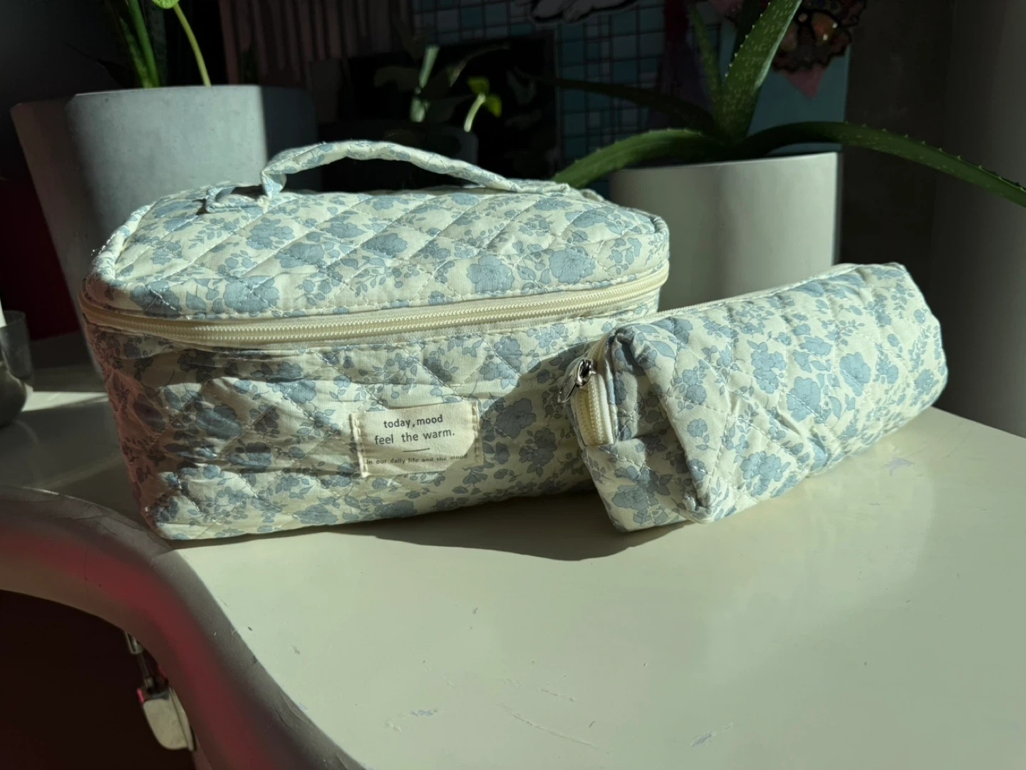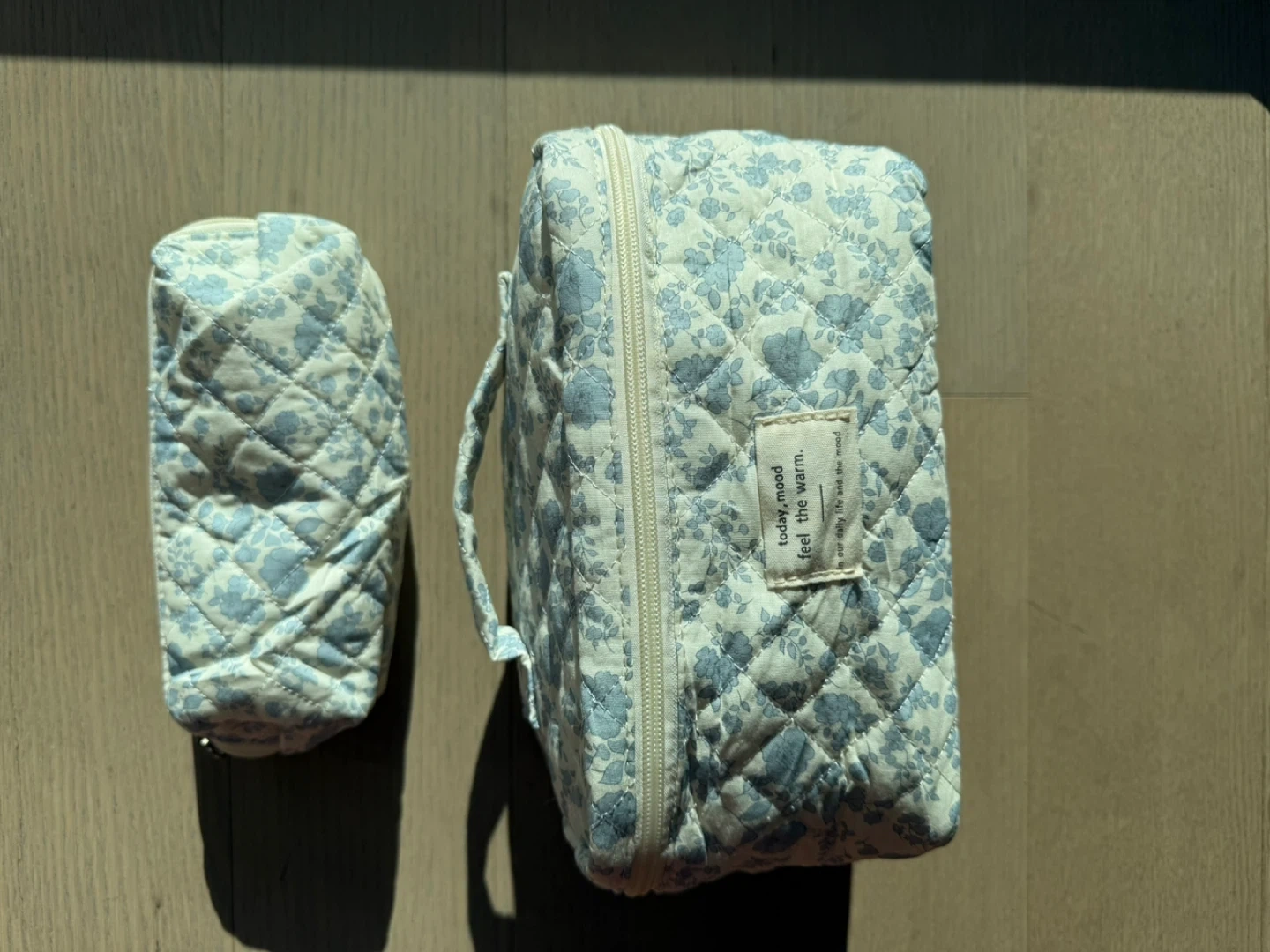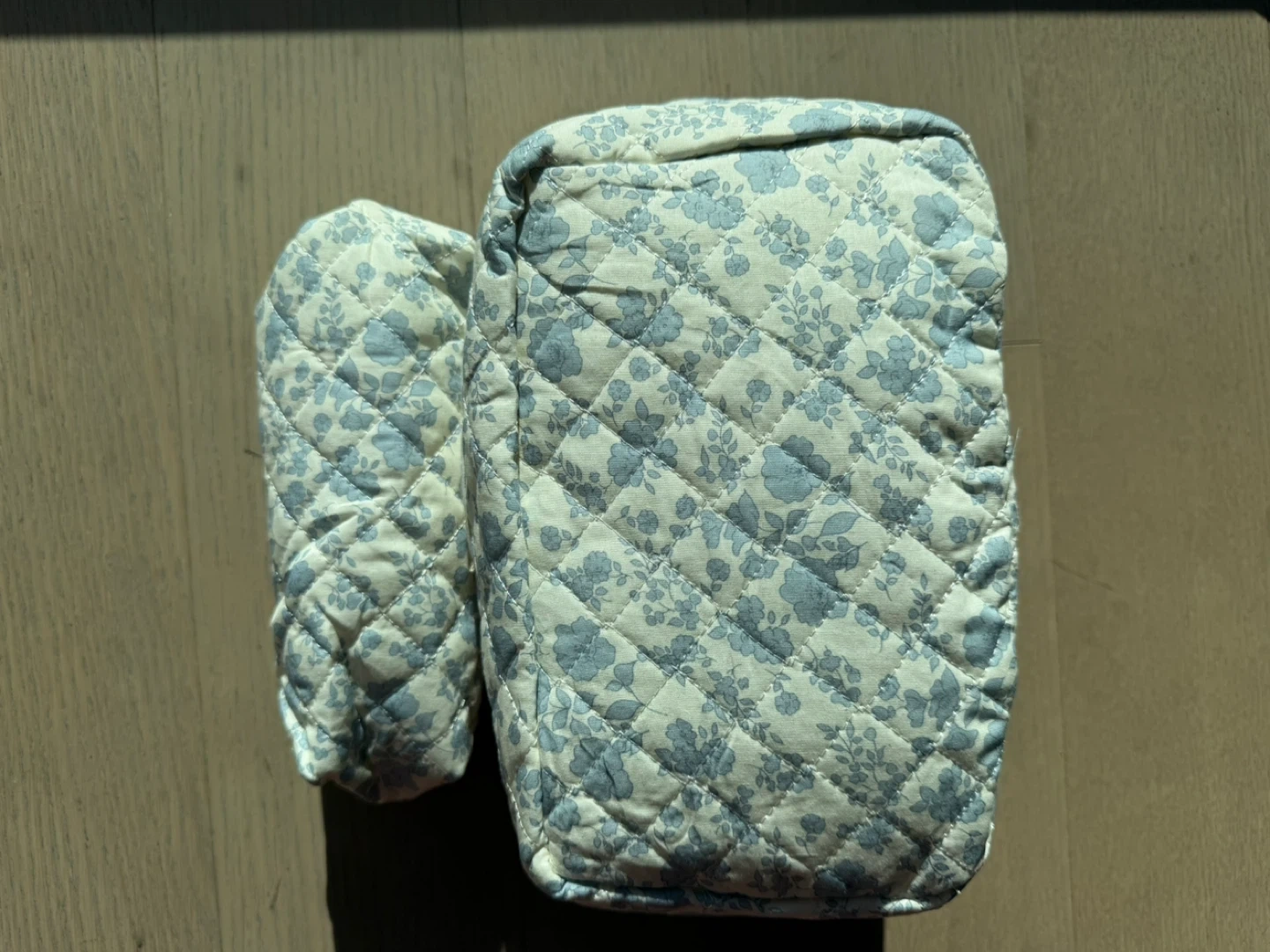Selling a new floral quilted cosmetic bag set! It includes two bags, one larger and one smaller, perfect for organizing your makeup and toiletries. Color: Off-white and blue flowers. 100% cotton New never used! Stored in a bag.