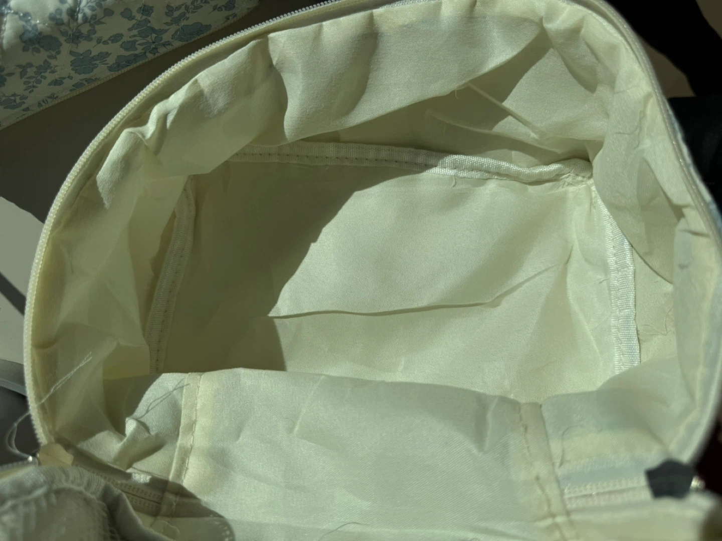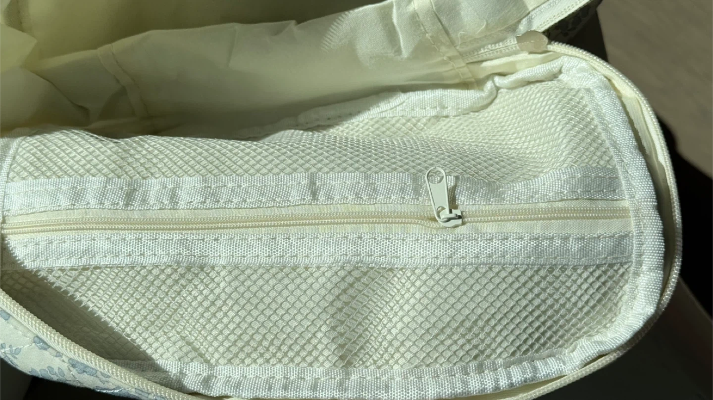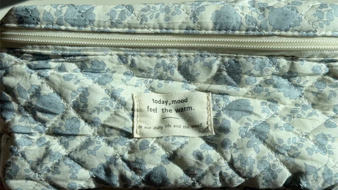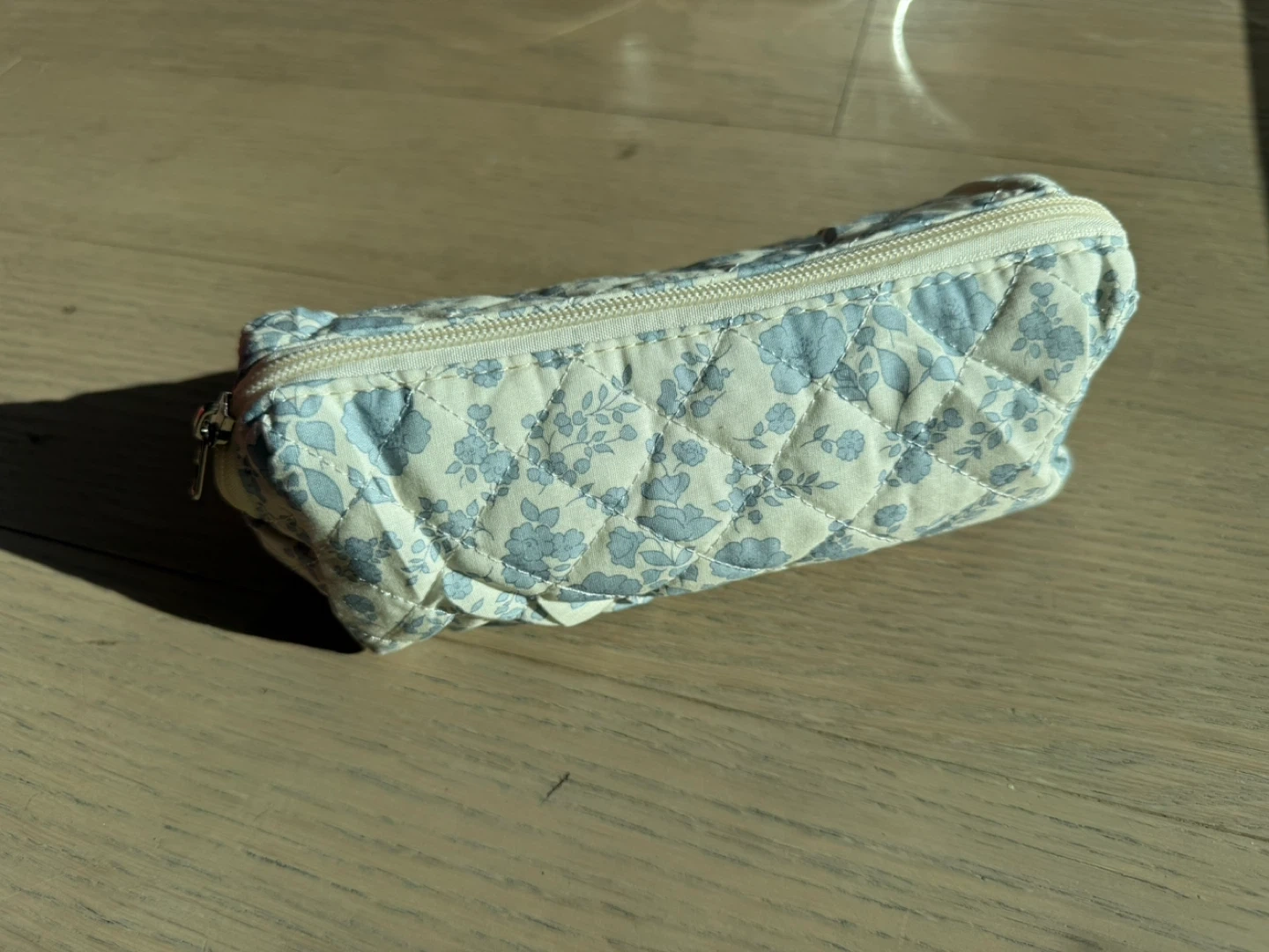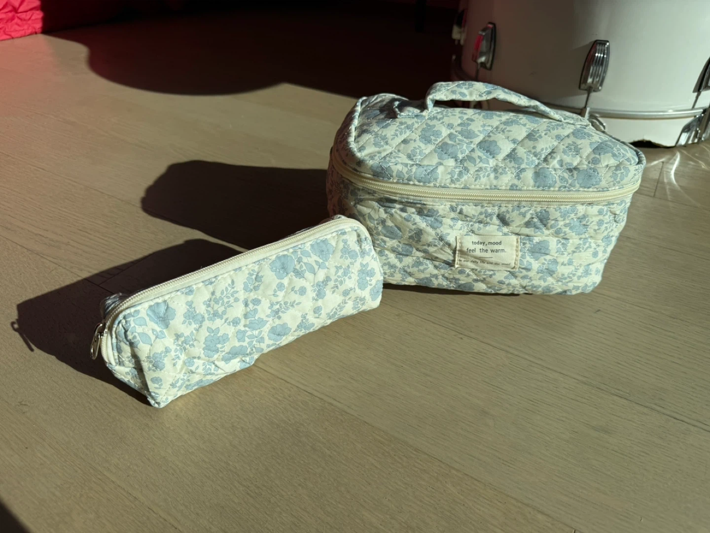 Selling a new floral quilted cosmetic bag set! It includes two bags, one larger and one smaller, perfect for organizing your makeup and toiletries. Color: Off-white and blue flowers. 100% cotton New never used! Stored in a bag.