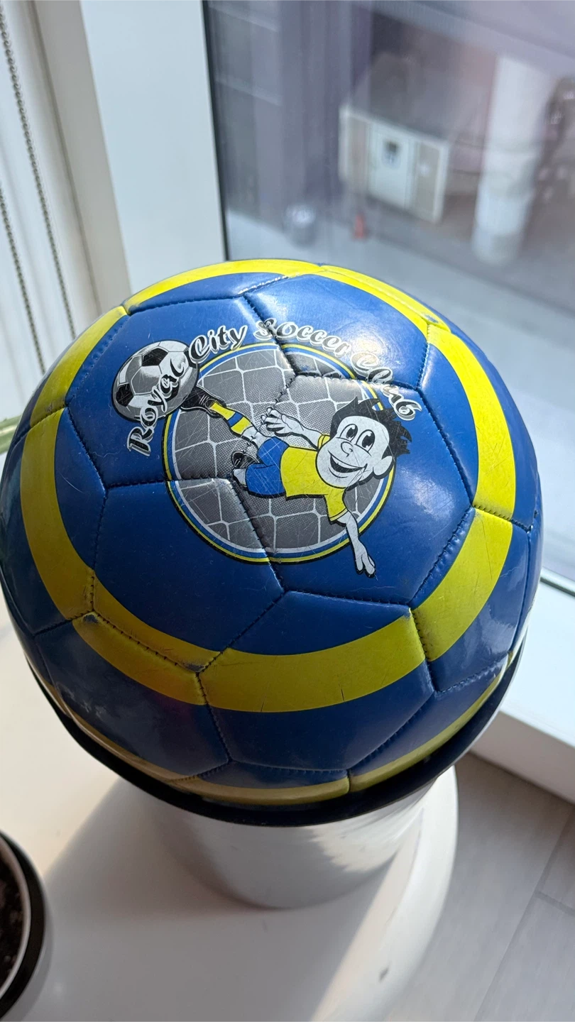 Selling a Locust soccer ball, size 5. It is blue and yellow and has a Royal City Soccer Club logo on it. It is designed and engineered in Denmark and made in China