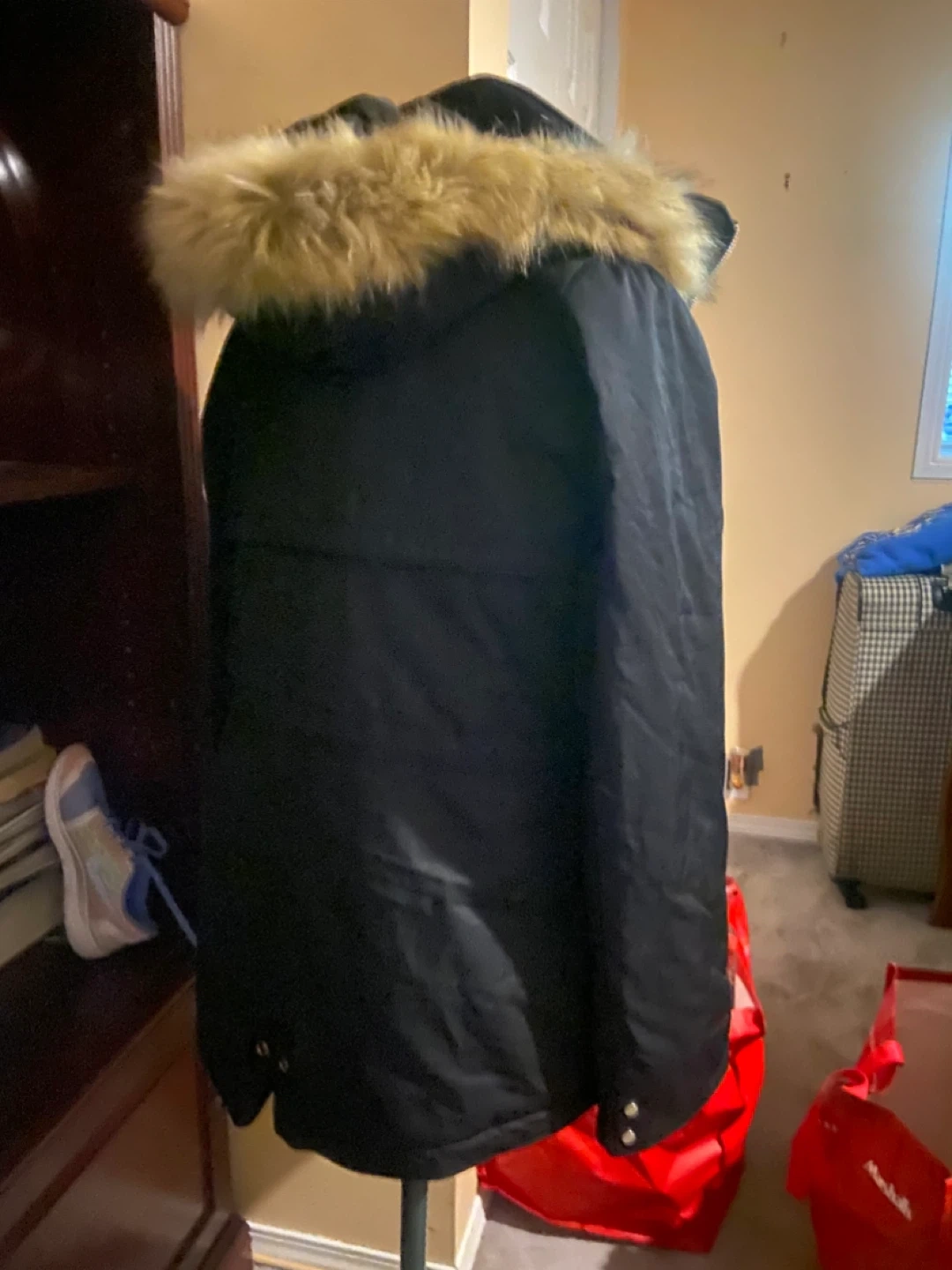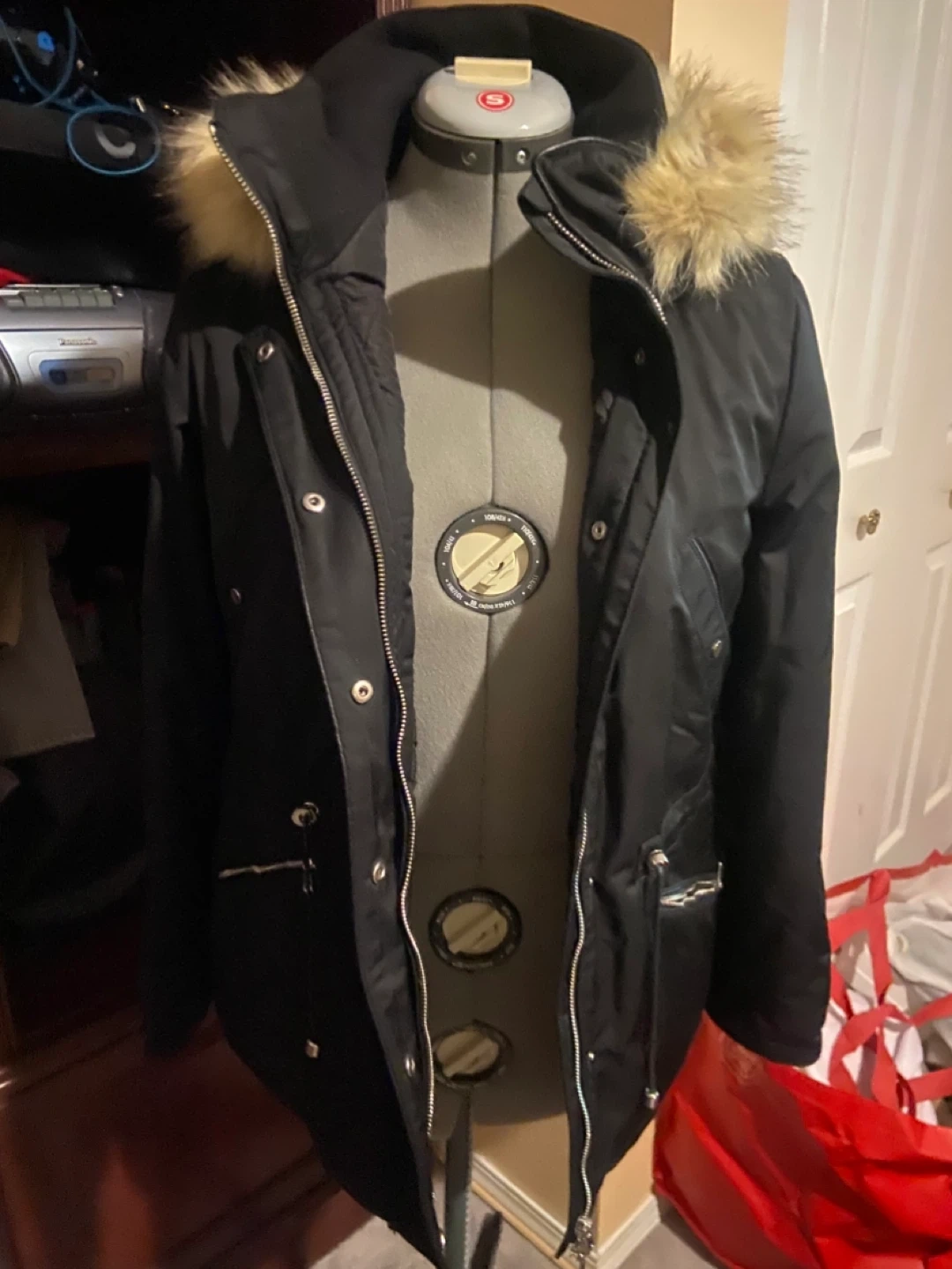 Cozy black winter parka, perfect for those cold Canadian days! It features a stylish faux fur trim on the hood to keep you extra warm and looking great