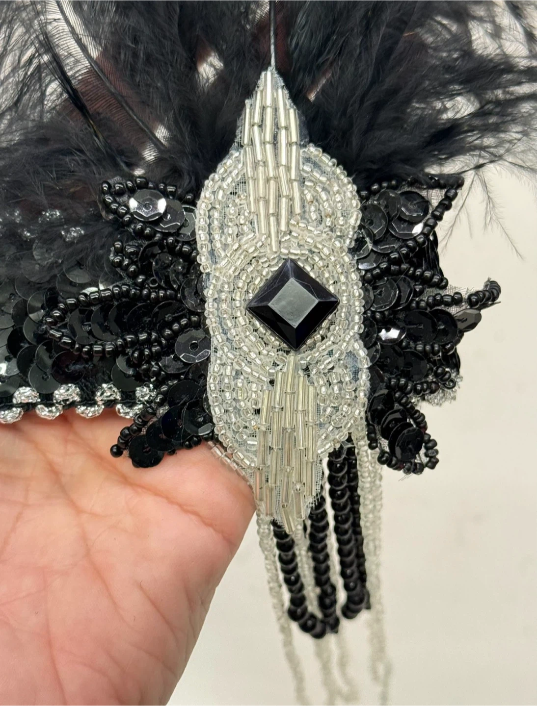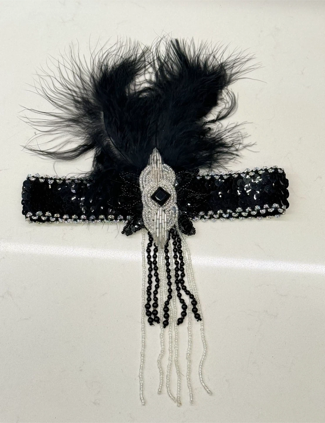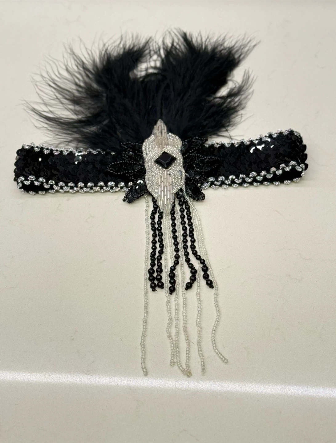 Add a touch of vintage glamour with this flapper-style headband! It features black feathers, sequins, and silver and black beaded details and elastic headband. Perfect for a themed party or special occasion- Halloween! ๐ป