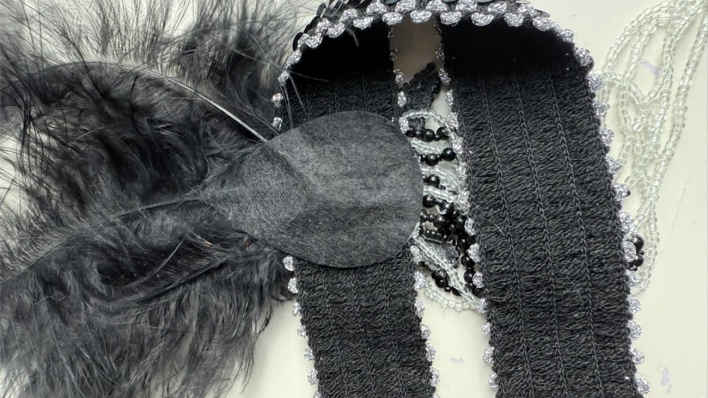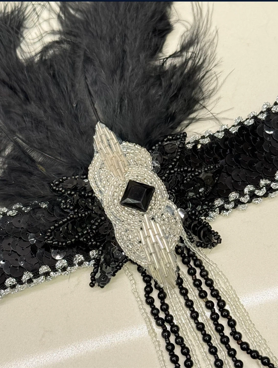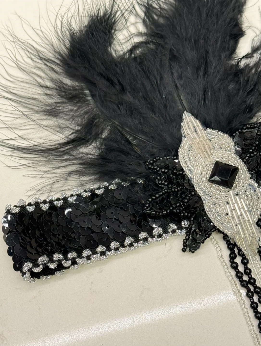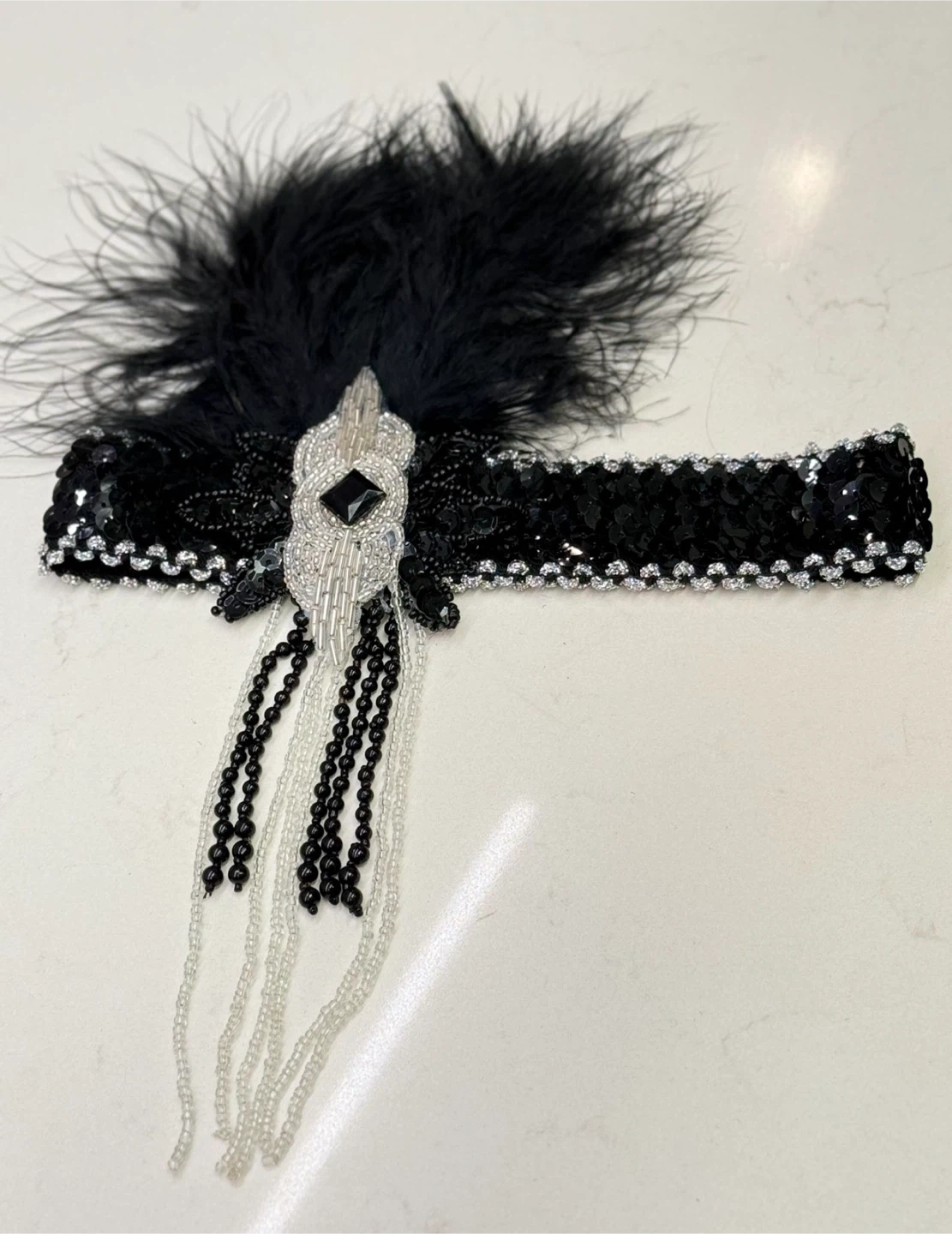 Add a touch of vintage glamour with this flapper-style headband! It features black feathers, sequins, and silver and black beaded details and elastic headband. Perfect for a themed party or special occasion- Halloween! ๐ป