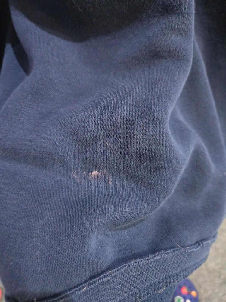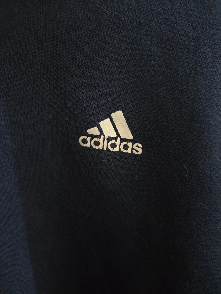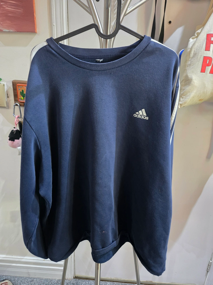 Selling an Adidas crewneck sweatshirt in navy blue. It features the classic three stripes on the sleeves and the Adidas logo on the chest. This has been well loved, has a few paint stains. No tag, fits like a mens L/XL.