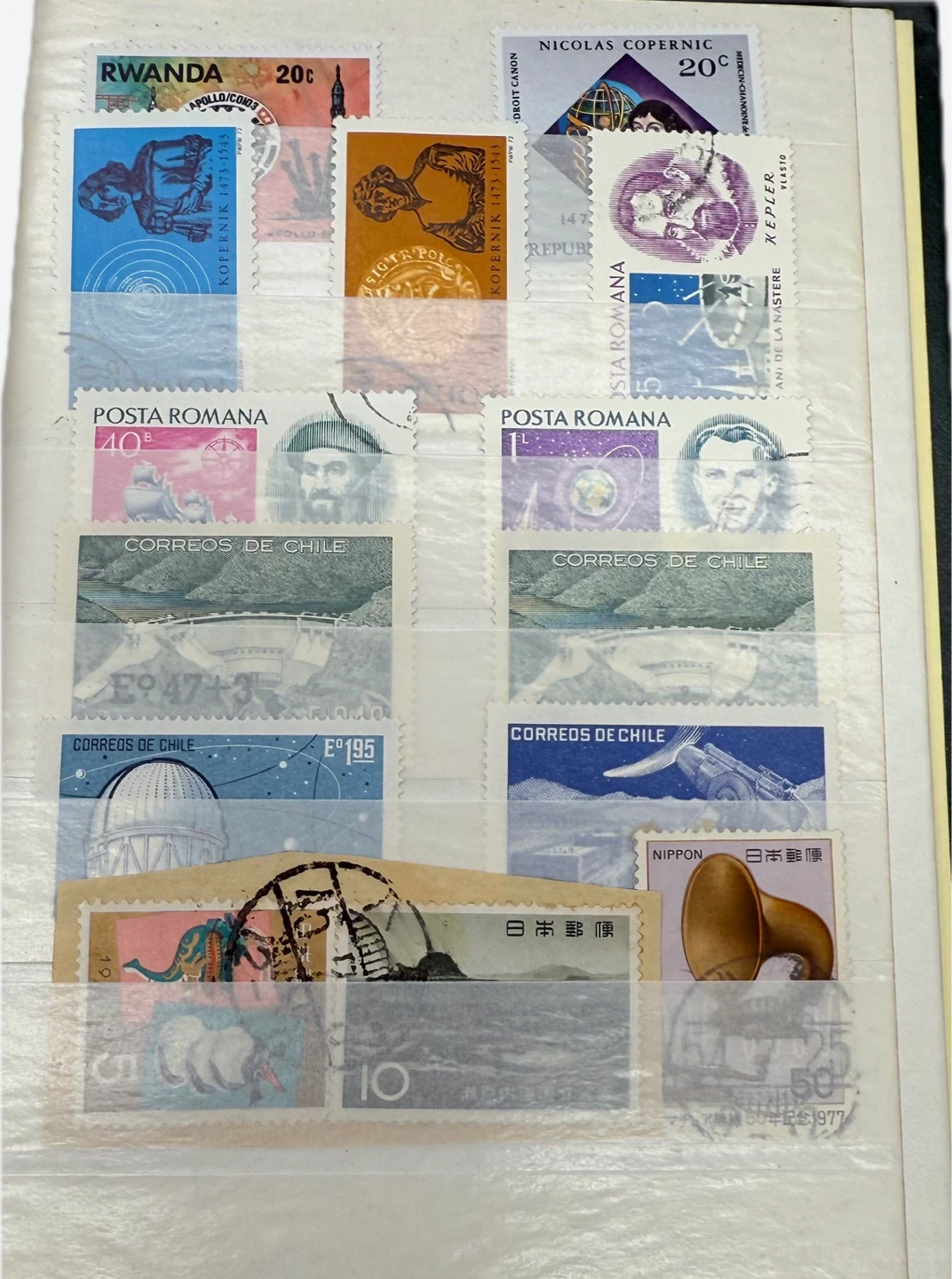 Selling a collection of vintage stamps from various countries, including Rwanda, Romania, Chile, and Japan. Some stamps feature historical figures like Nicolas Copernicus and Kepler. Great for collectors!