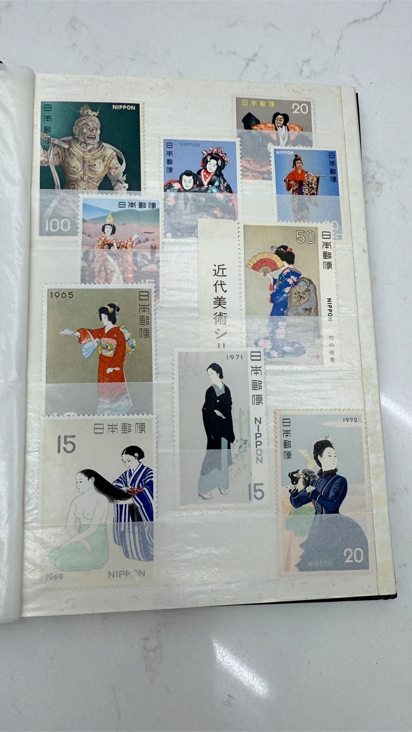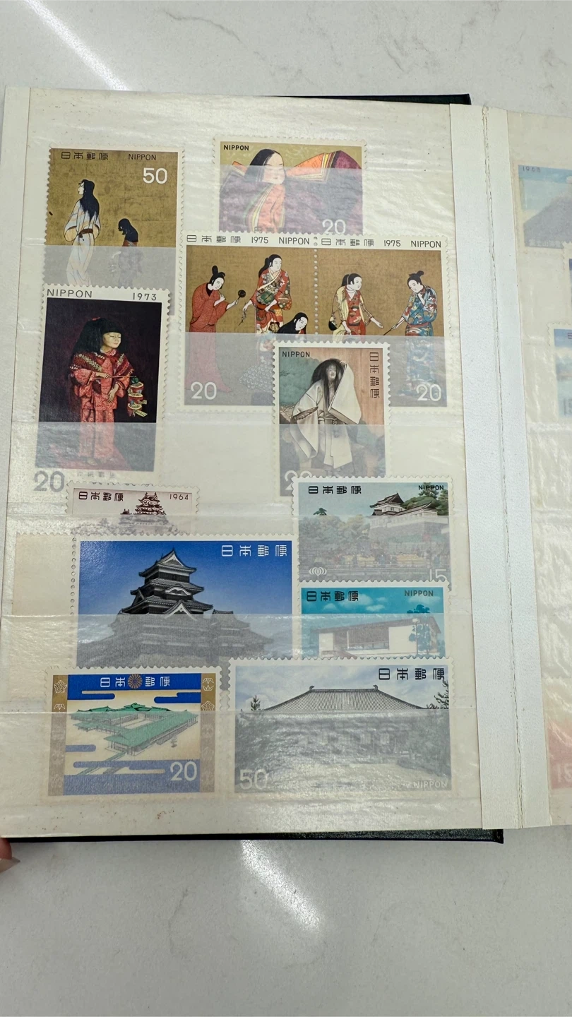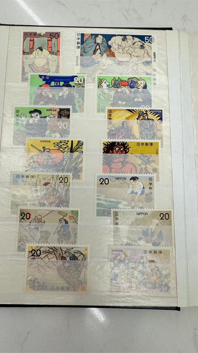 Selling a collection of vintage Japanese stamps housed in a "The Stamp Collector's Stock Book". The stamps feature various designs, including traditional Japanese scenes, landscapes, and figures. A great find for any stamp collector! My personal collection from a trip I took in 1990 and this was a gift from my Japanese host family ๐
