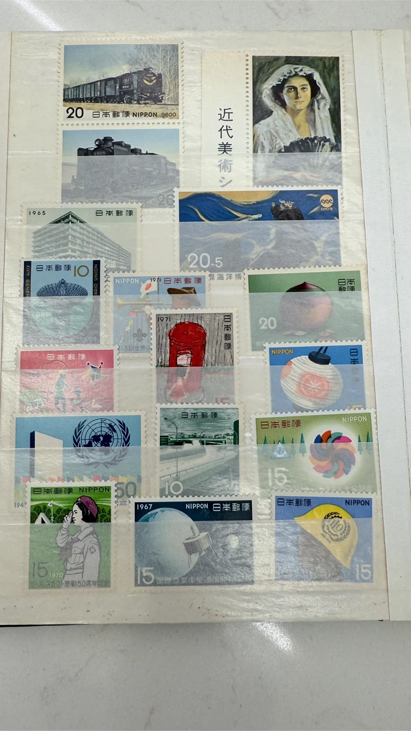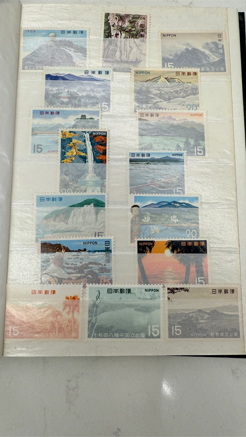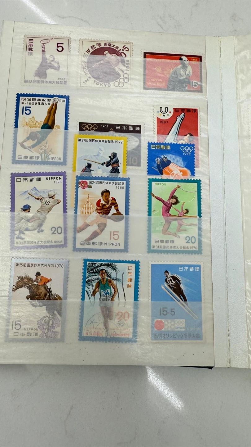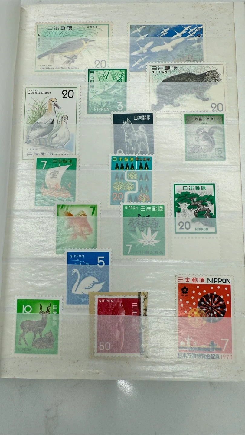 Selling a collection of vintage Japanese stamps housed in a "The Stamp Collector's Stock Book". The stamps feature various designs, including traditional Japanese scenes, landscapes, and figures. A great find for any stamp collector! My personal collection from a trip I took in 1990 and this was a gift from my Japanese host family ๐
