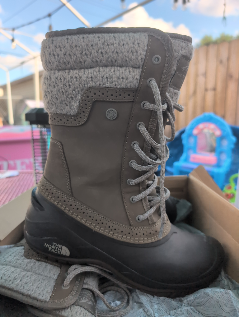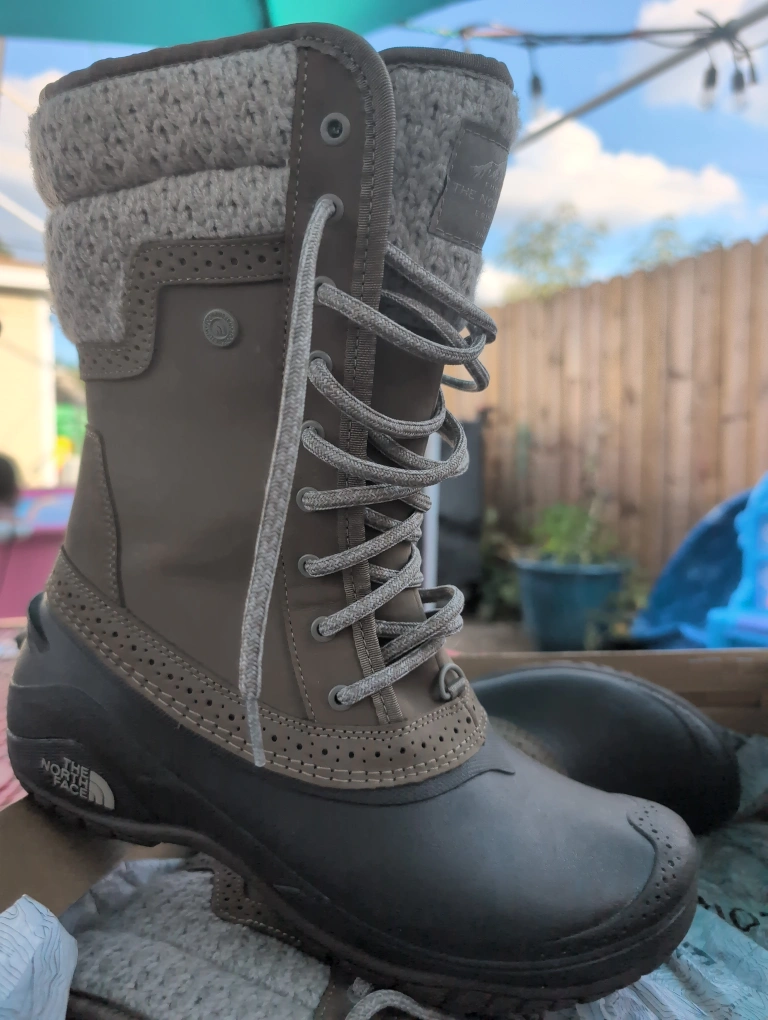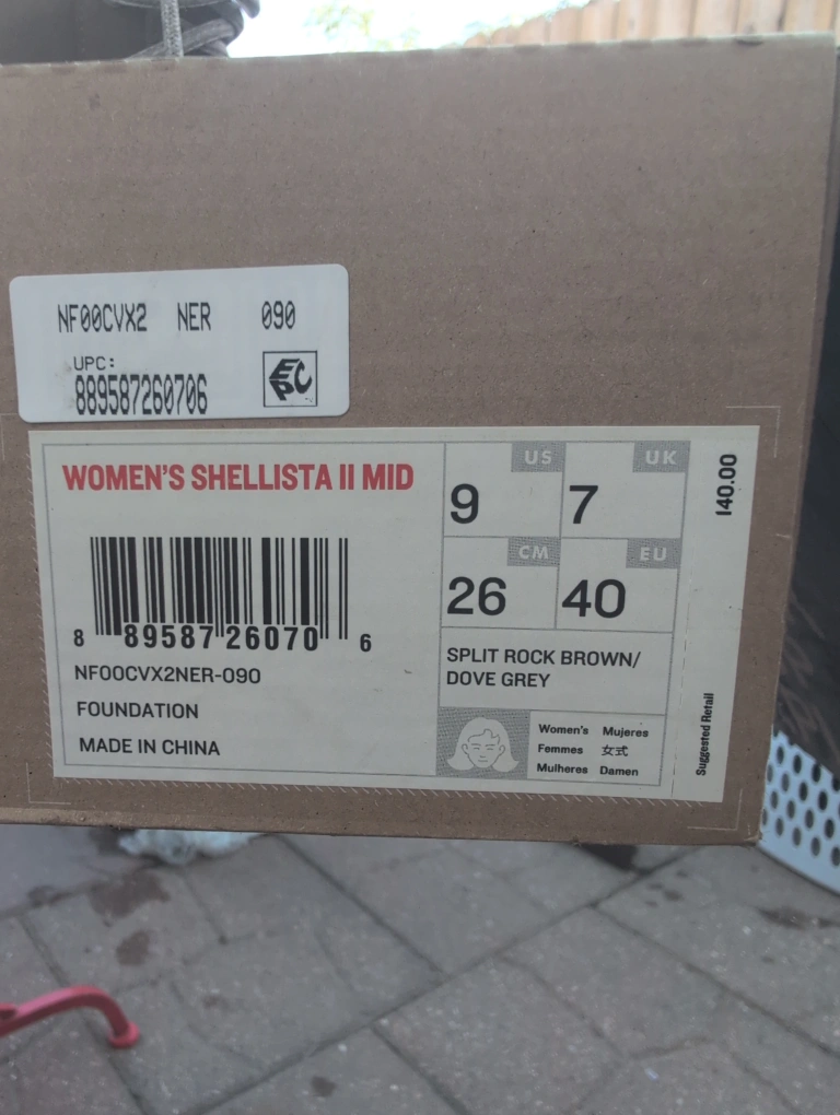 Selling a pair of The North Face Shellista II Mid women's boots in US size 9. The color is a stylish split rock brown/dove grey. They come with the original box. These boots are perfect for keeping your feet warm and dry in colder weather!
