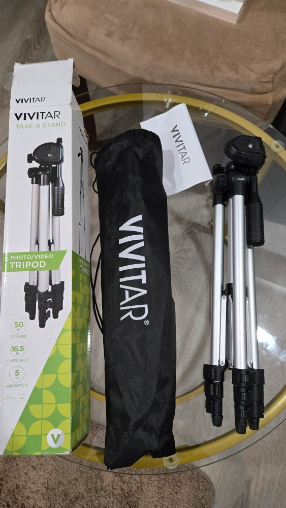 Selling a Vivitar photo/video tripod. It comes with its original box and a carrying bag. The tripod extends up to 50 inches and has a folded length of 16.5 inches. It can handle a load capacity of up to 5 lbs