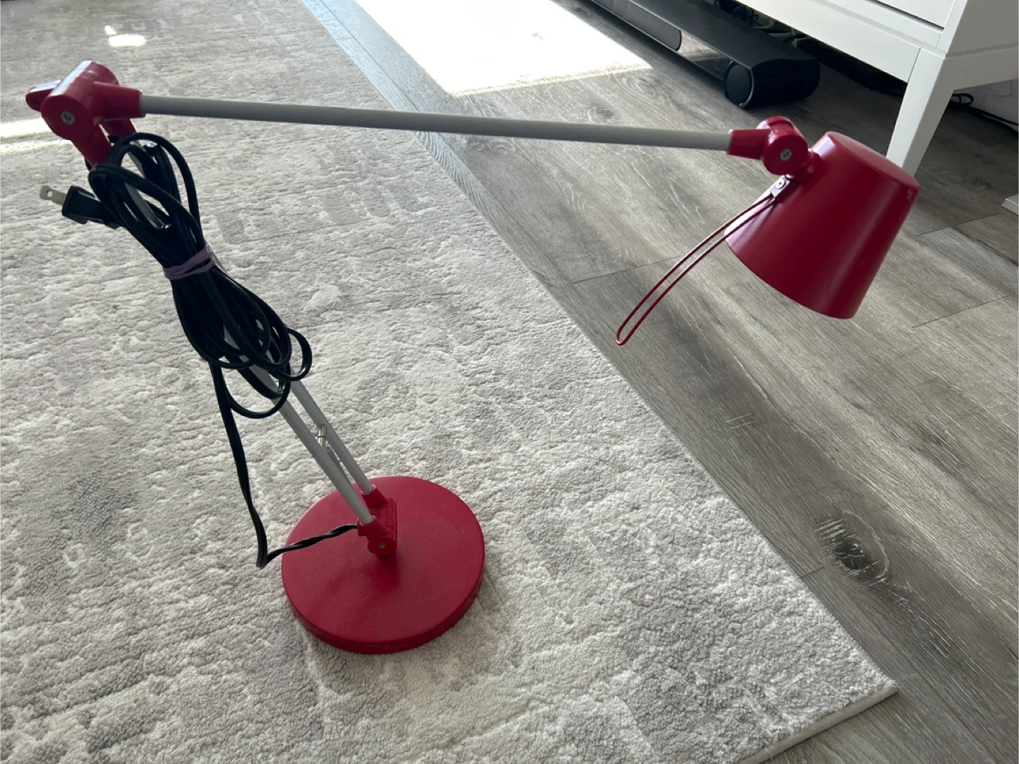 Selling a red desk lamp! It has a sleek design and would be a great addition to any workspace or bedside table. The lamp is in good condition and ready to brighten up your day