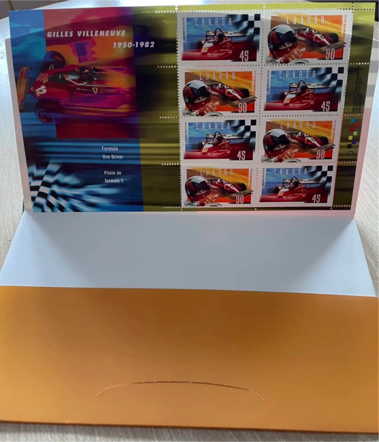 Canada Post stamp collection celebrating Gilles Villeneuve, a Formula One driver. Includes eight stamps with values of 45 and 90 cents.