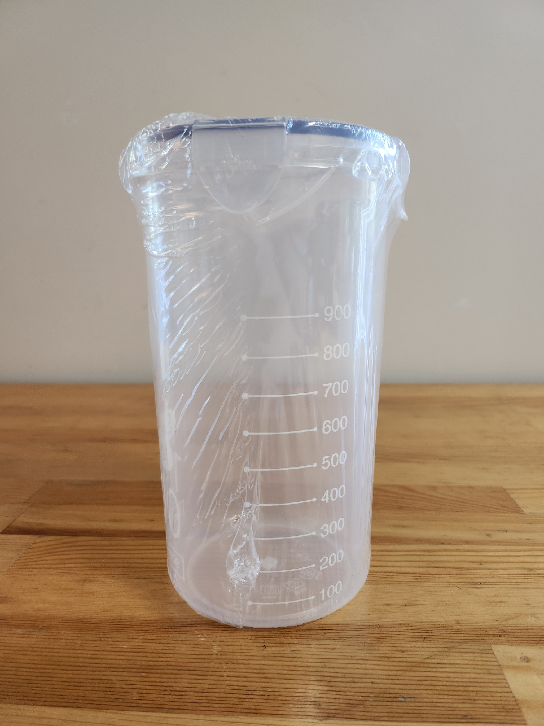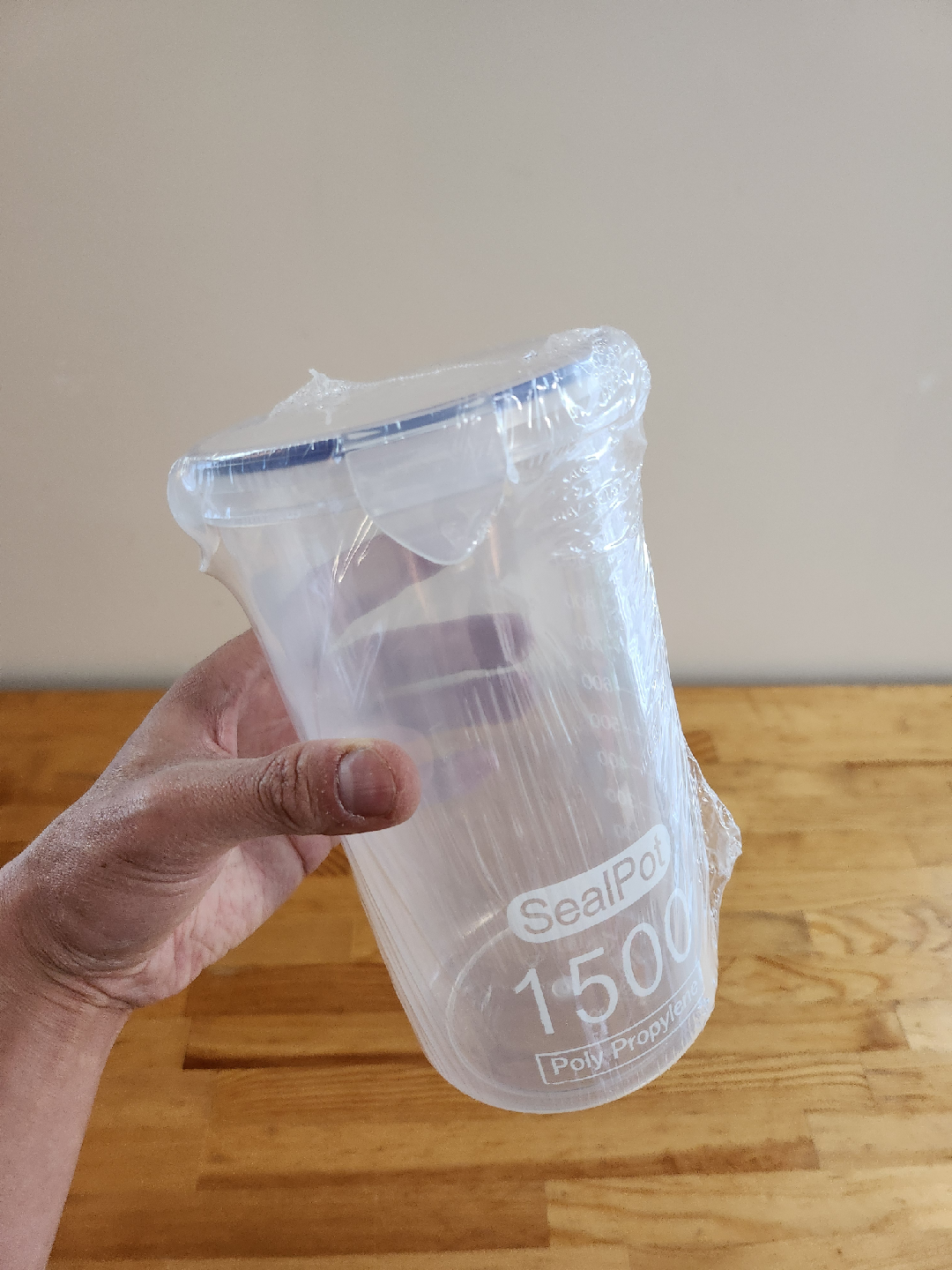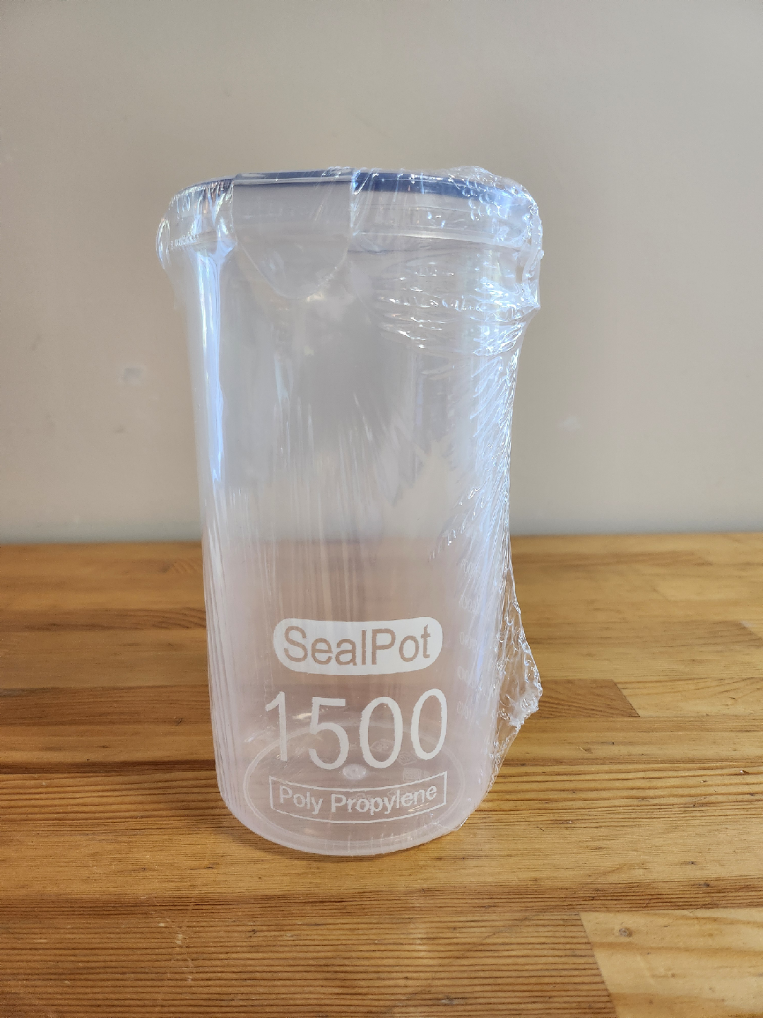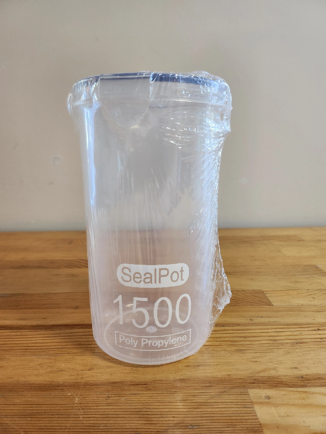 A SealPot measuring cup. It's 1500ml and made of Poly Propylene. It is still sealed in the original plastic wrapping.