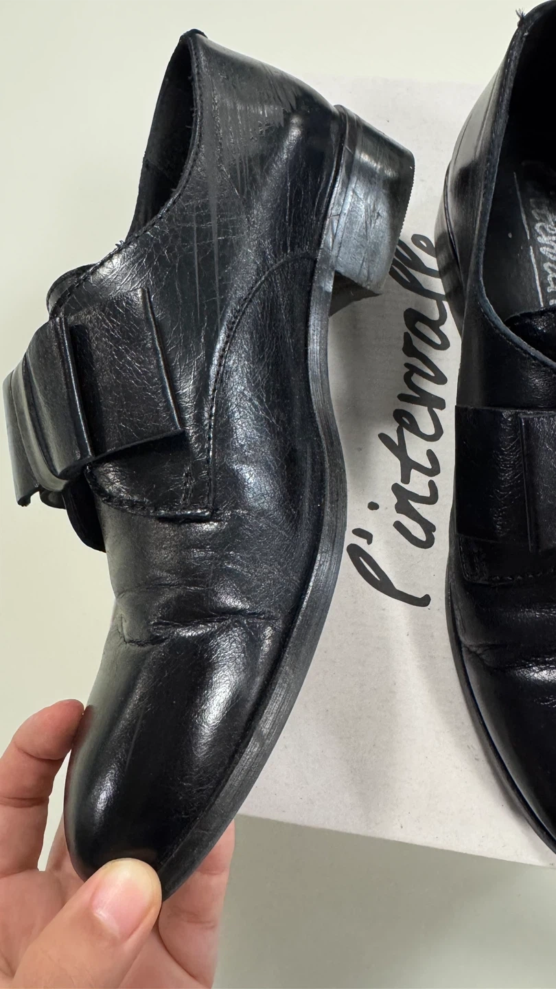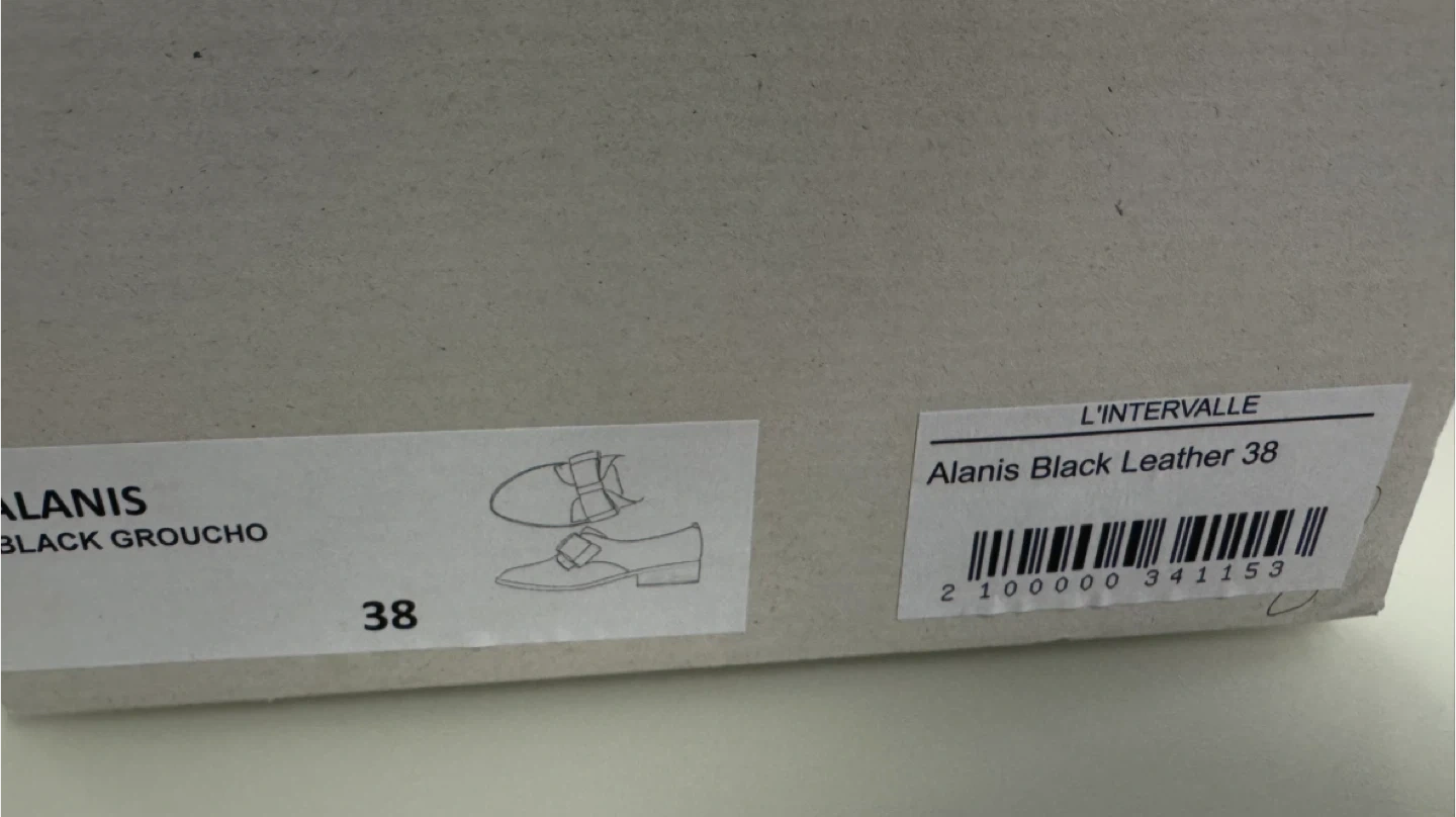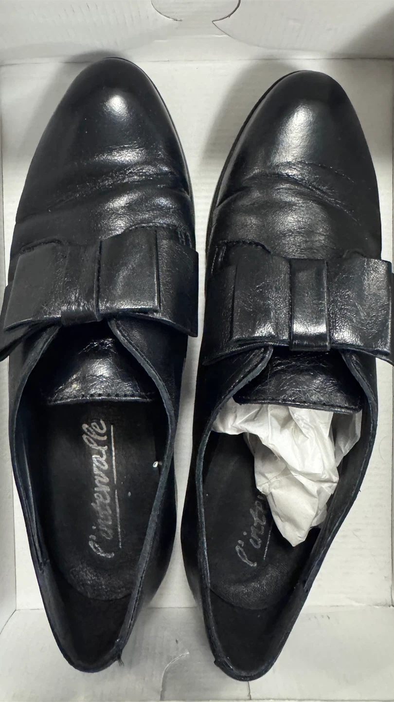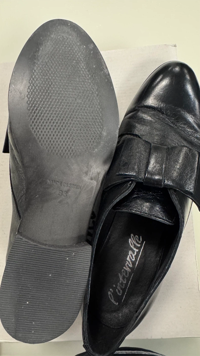 Selling a pair of L'intervalle black leather shoes in size 38. They come with the original box. These shoes have a stylish bow detail and are made in Spain. Please check the photos for signs of wear.
