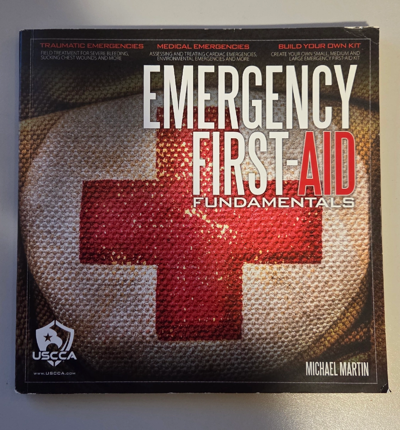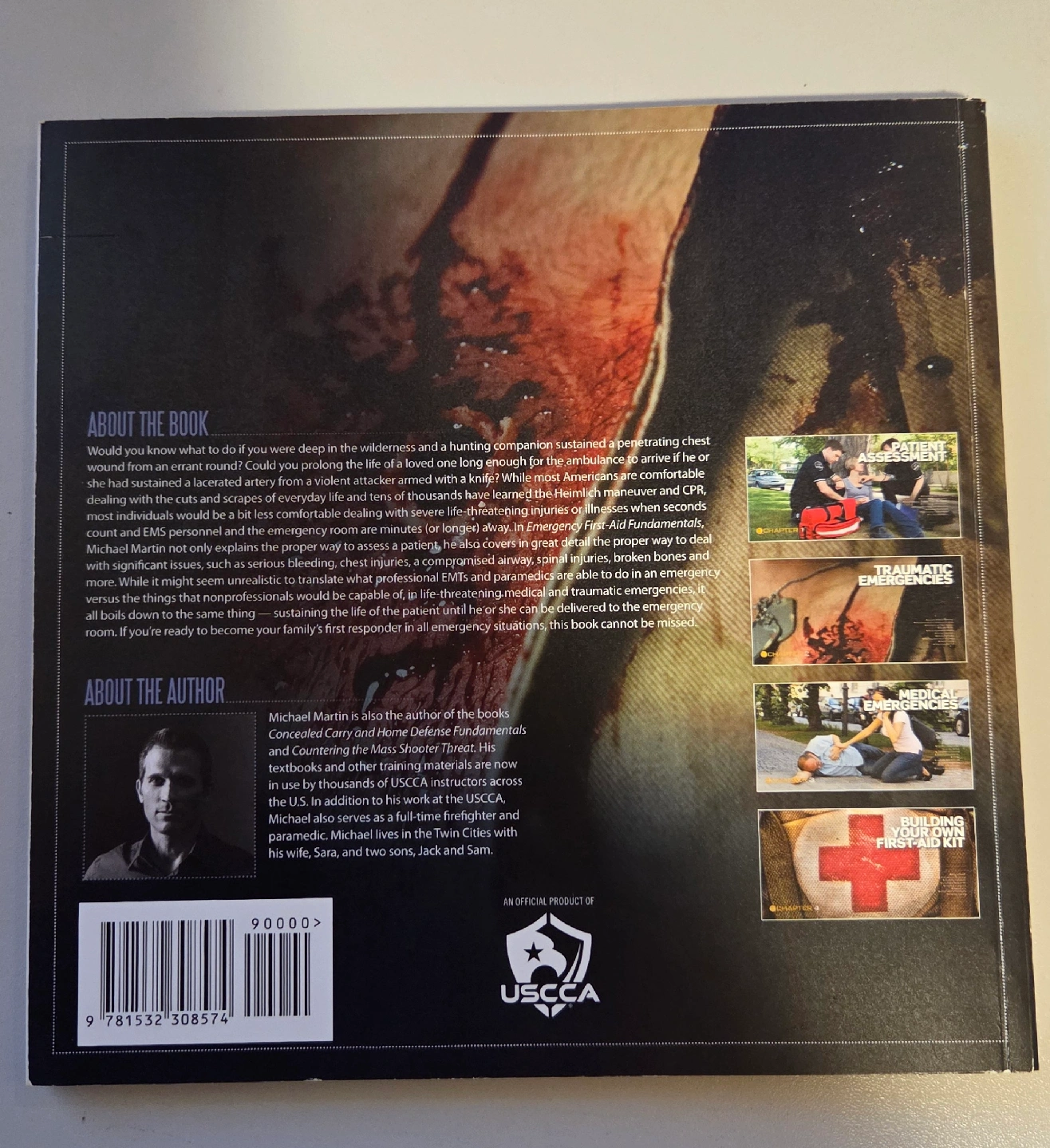 Selling a book titled Emergency First-Aid Fundamentals by Michael Martin. It covers traumatic and medical emergencies, and how to build your own first-aid kit. This book is an official product of USCCA