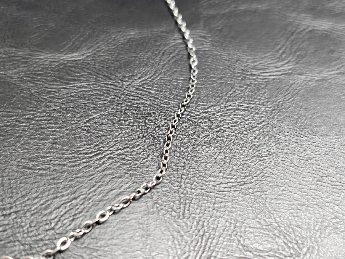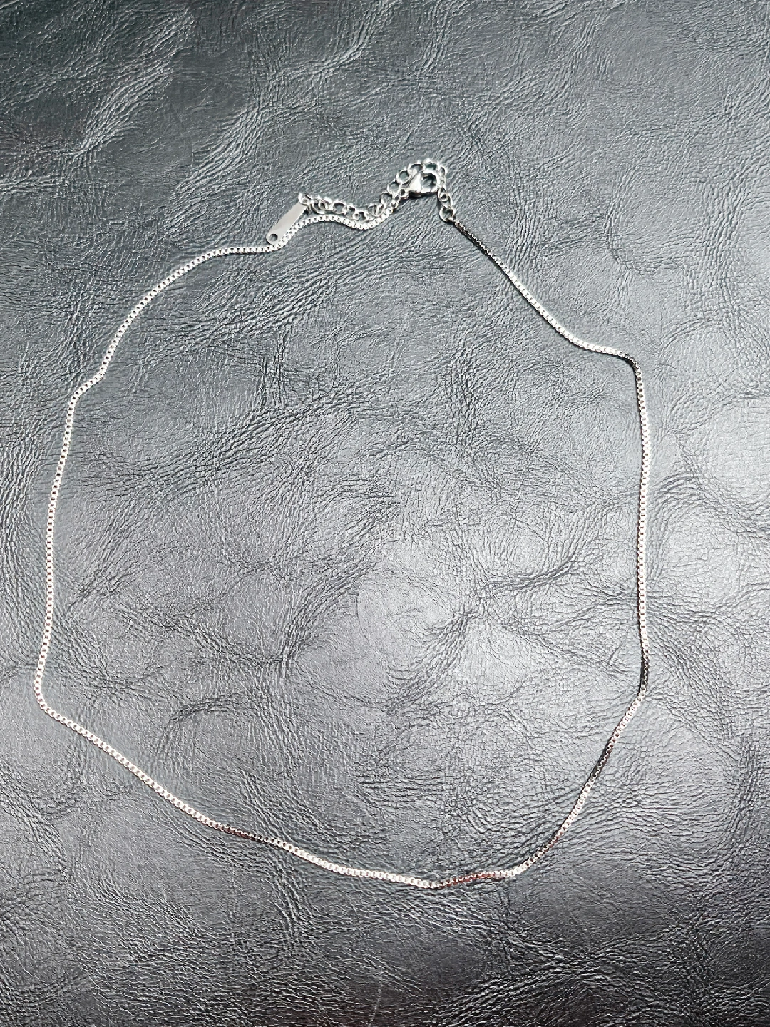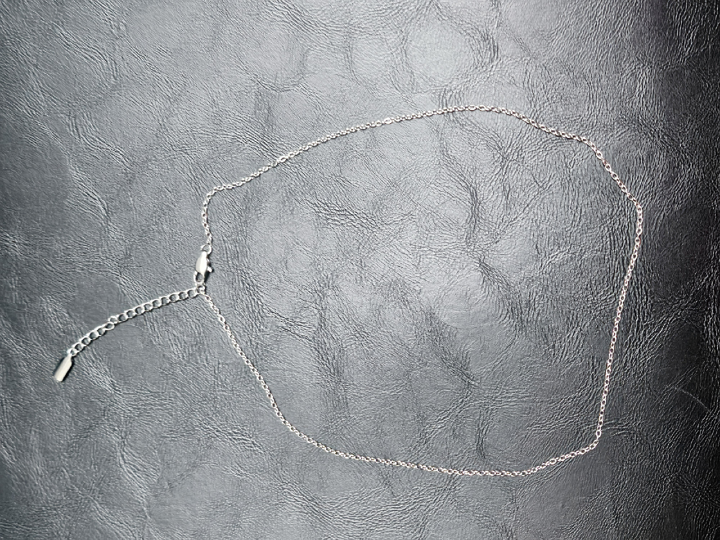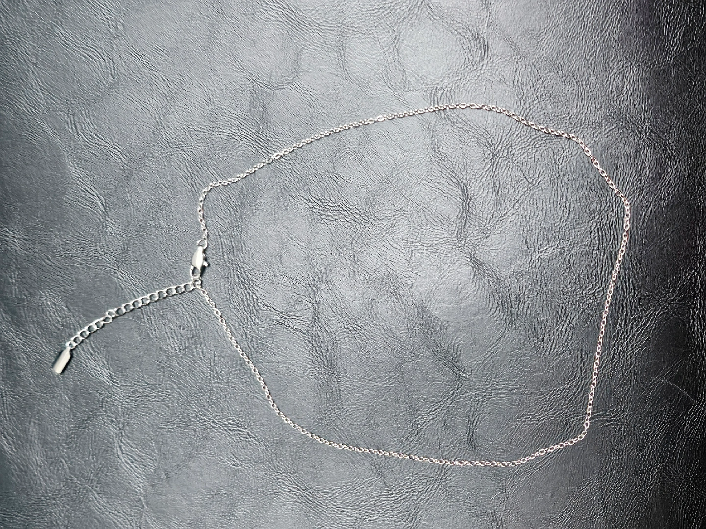 a simple stainless steel chain necklace. very durable and hypoallergenic. 16" length with an extender. Never used.