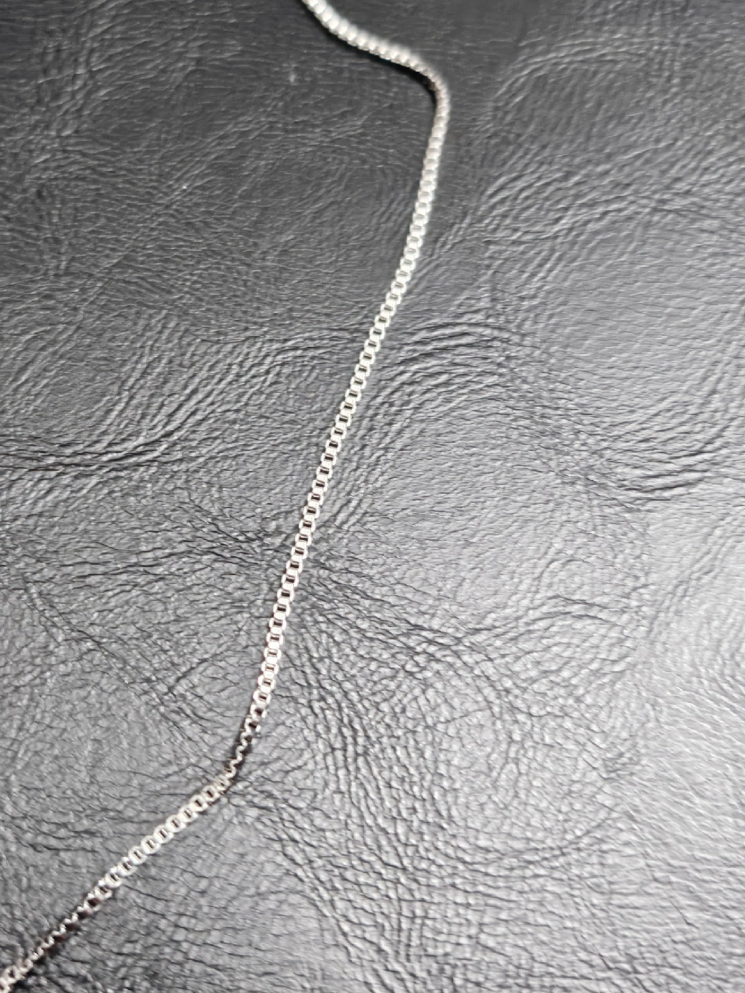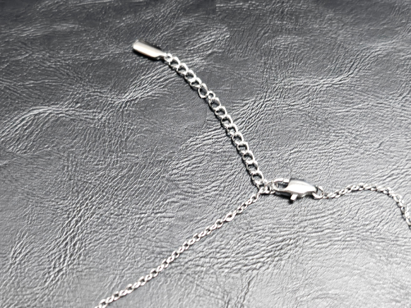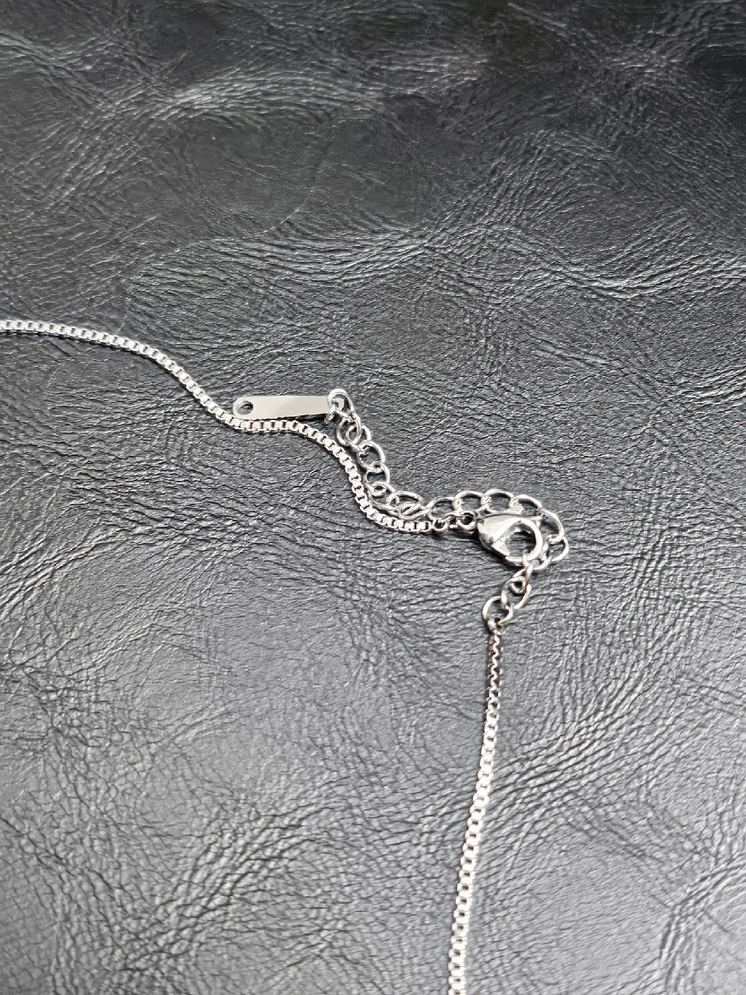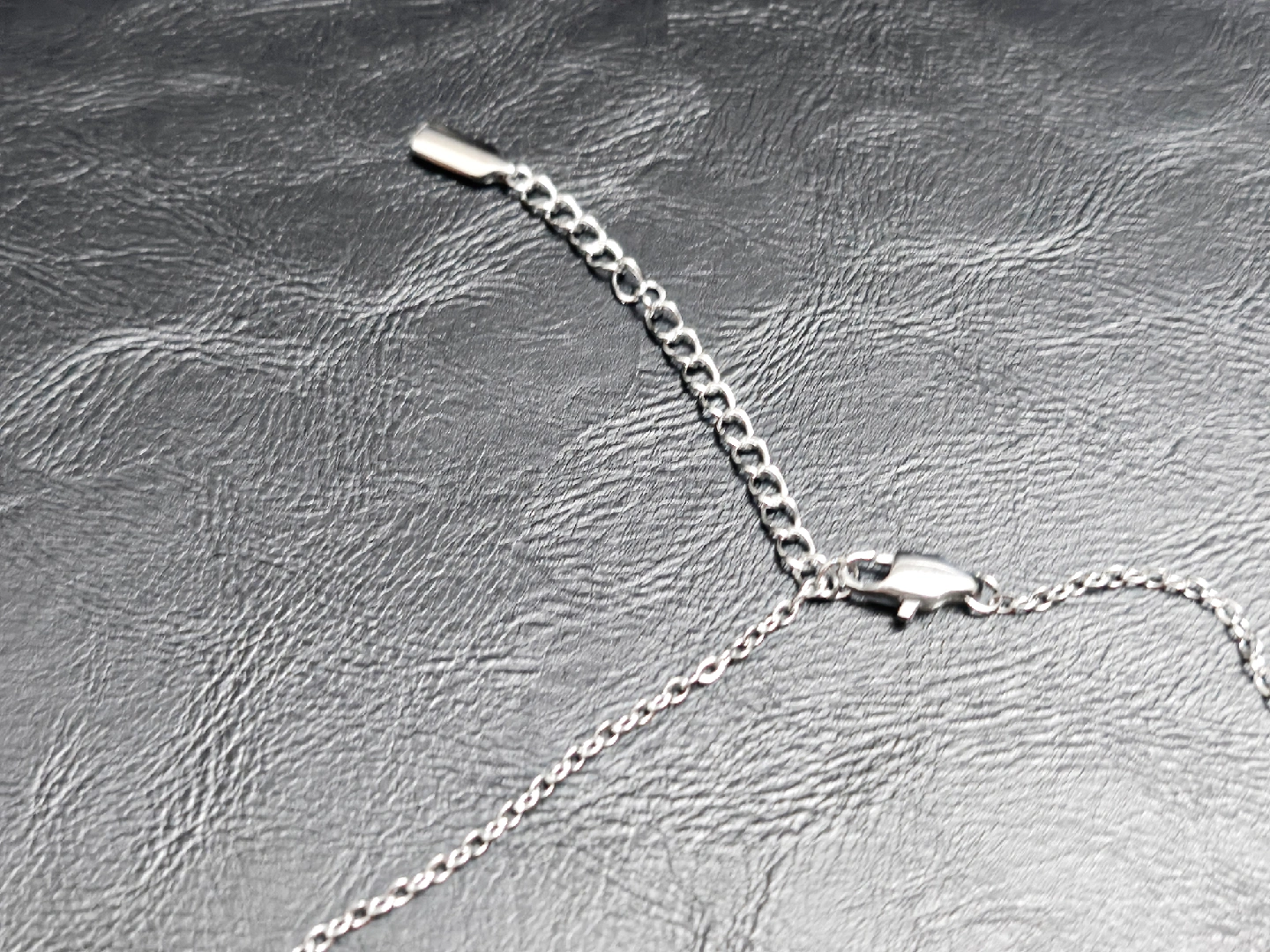 a simple stainless steel chain necklace. very durable and hypoallergenic. 16" length with an extender. Never used.
