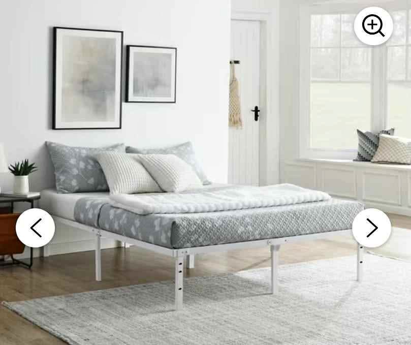 Like new in excellent shape and sturdy. Mainstays Full 14” Heavy Duty Steel Slat Platform Bed Frame with Storage Space Under Frame, No Box Spring Required, White