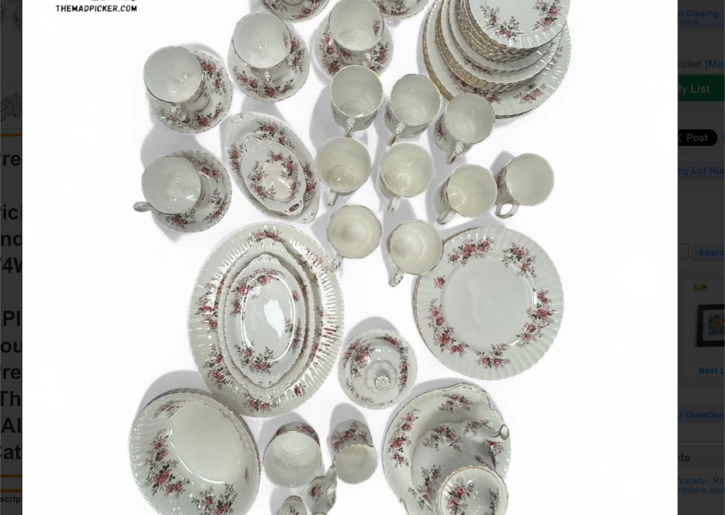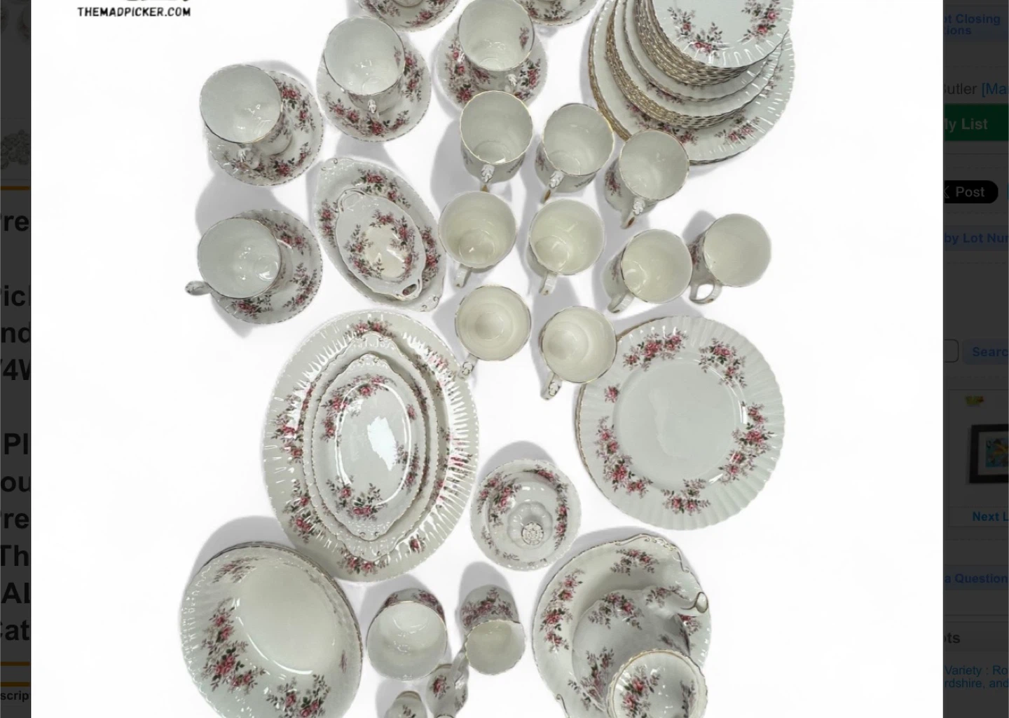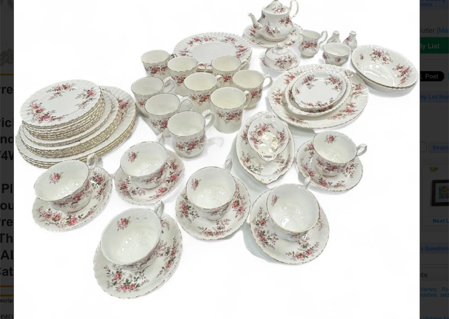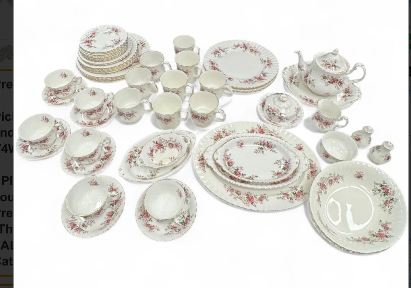 Selling a beautiful Royal Albert 'Memory Lane' bone china set. This set features a delicate pink rose pattern and is perfect for adding a touch of elegance to your dining experience. It includes various pieces such as plates, cups, saucers, and serving dishes.