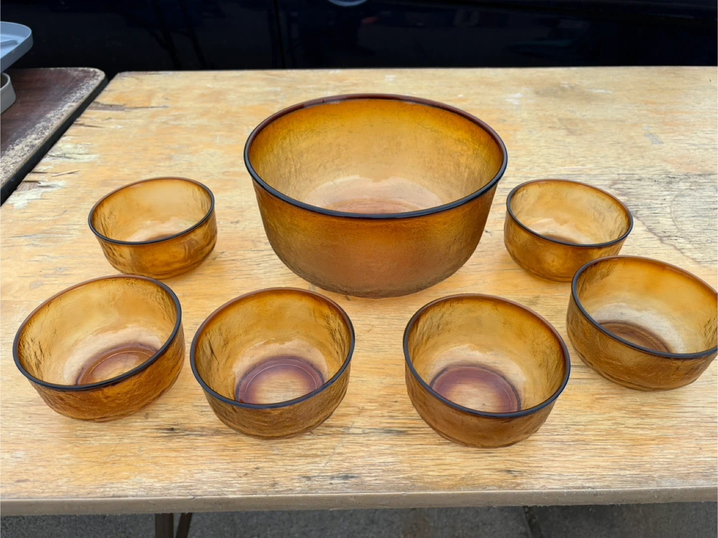 Selling a lovely vintage amber glass bowl set! It includes one large serving bowl and six smaller bowls. Perfect for adding a touch of retro charm to your kitchen or dining room. The set is in great condition and ready for a new home!