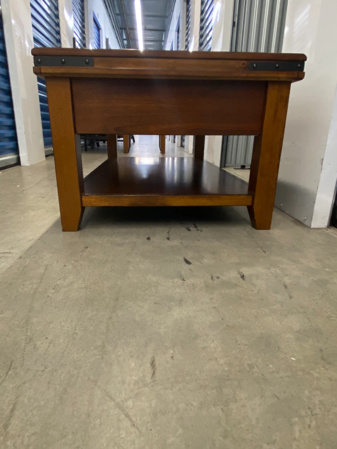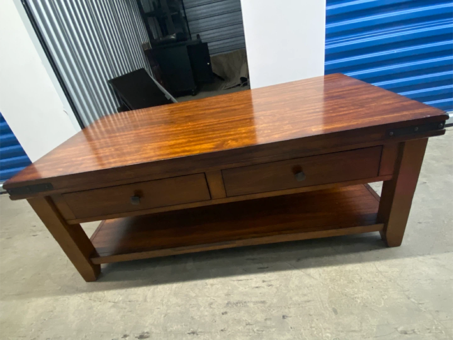 A lovely wood coffee table with two drawers for storage. It also has a shelf at the bottom for extra space. This table would look great in any living room!