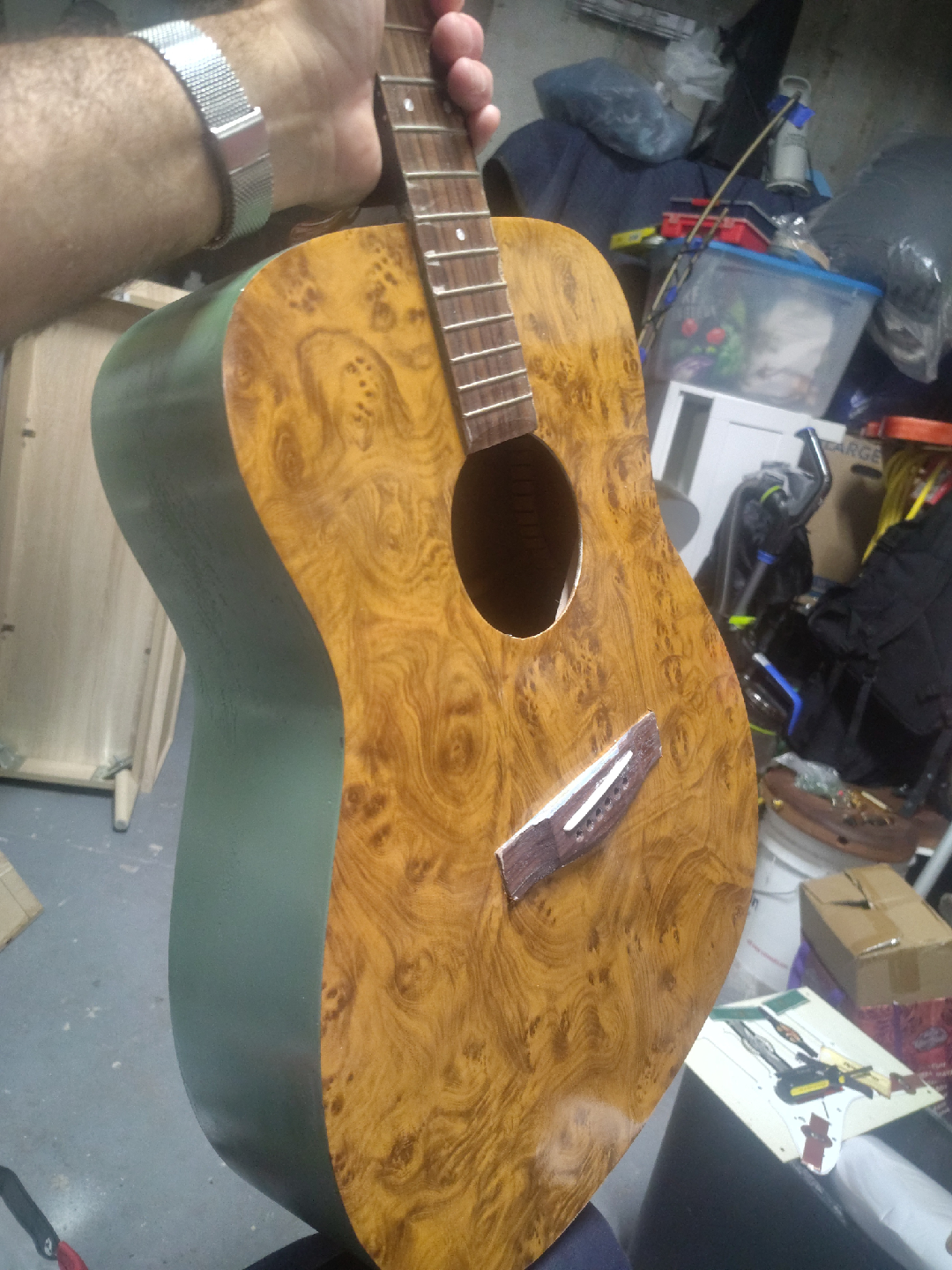 **this is a project guitar. front is vinyl wrapped. sides and back are painted a beautiful green color. I'm still in the middle of finishing it up. but will come as is unless I do more work to it. it sounds great when the strings are on. it's my first and last time working on a acoustic guitar. it was found outside on the street, no heavy damage, but looked like someone over sanded it which is why I decided to put the vinyl over it and paint it. **