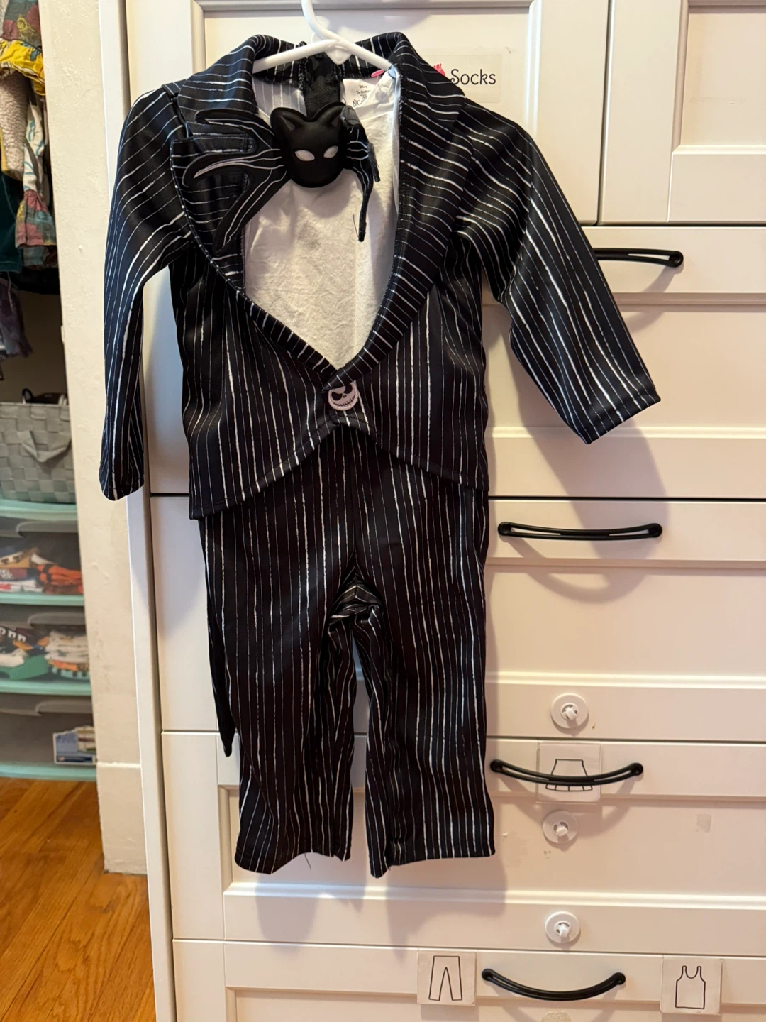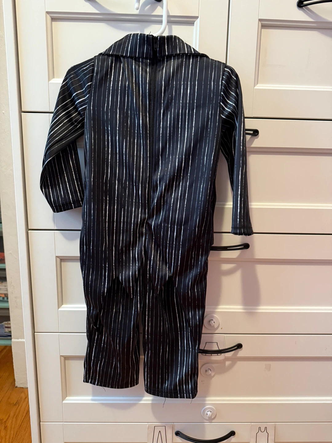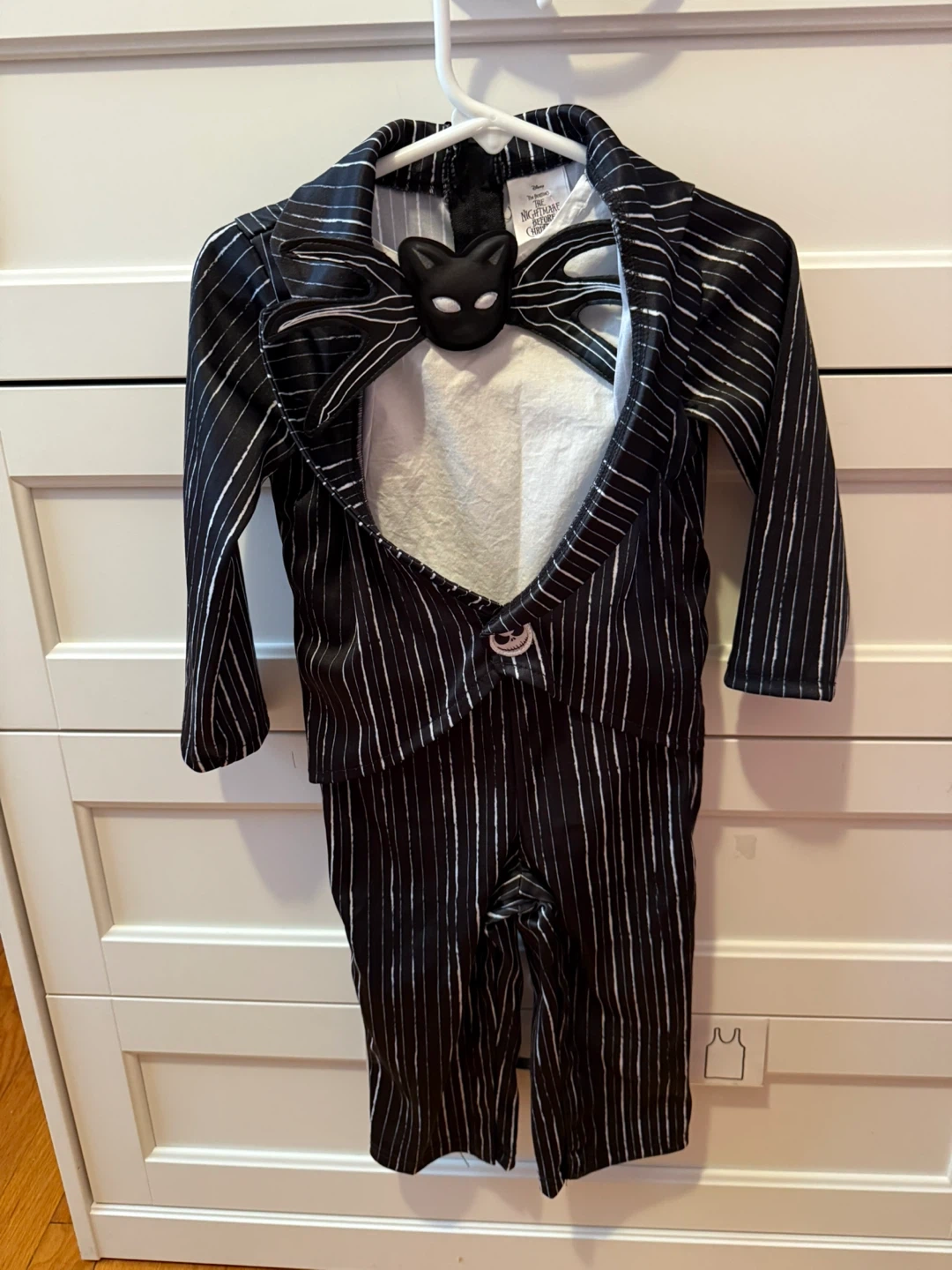 This is a Nightmare Before Christmas baby costume. It includes a striped jacket with attached shirt and pants, and a Jack Skellington hat. Perfect for Halloween or dress-up! 18months old