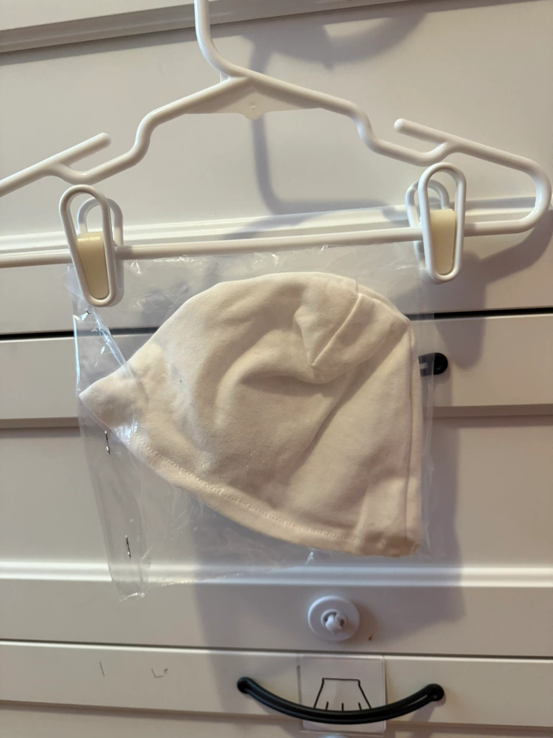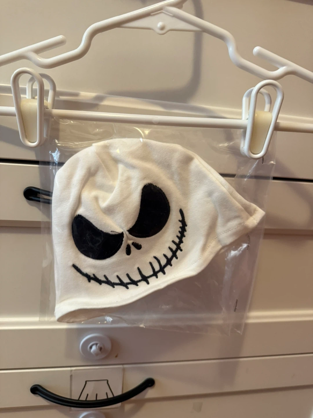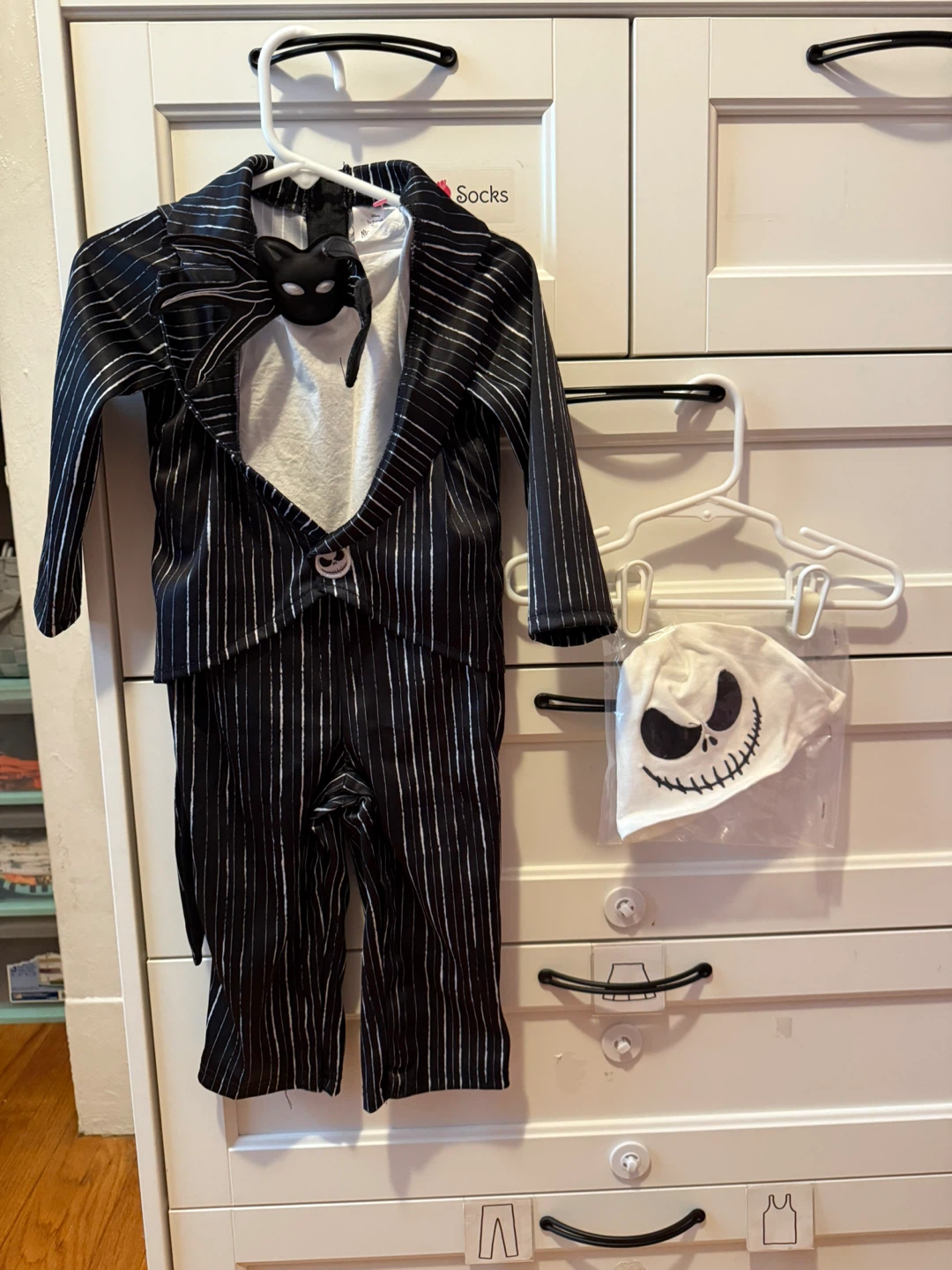 This is a Nightmare Before Christmas baby costume. It includes a striped jacket with attached shirt and pants, and a Jack Skellington hat. Perfect for Halloween or dress-up! 18months old