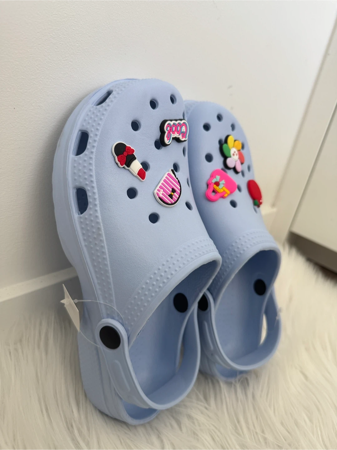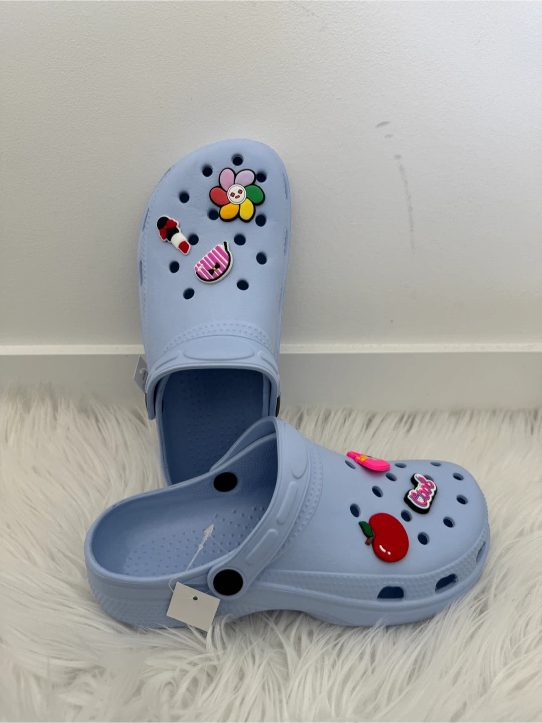 Cute light blue Crocs in a size 7! They've got fun little charms on them to add some personality to your step. Perfect for adding a touch of whimsy to your everyday wear.